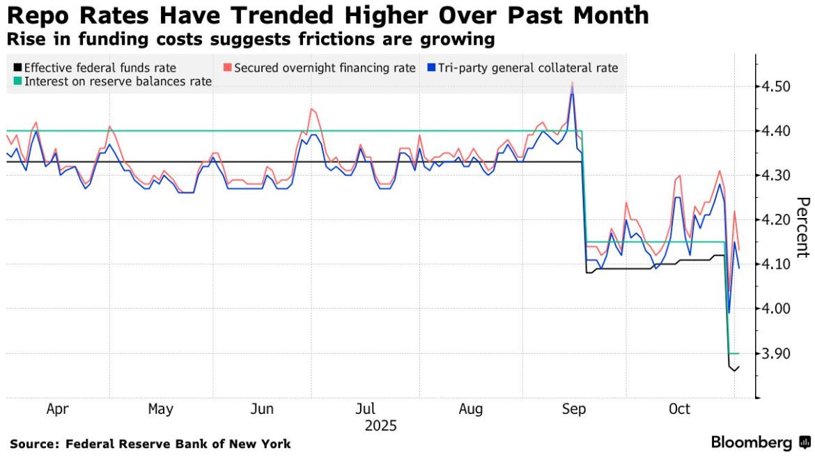 上周五,SOFR较IORB高出32个基点,为2020年以来最大利差,周一回落至4.13%。目前仍高于IORB(当前为3.9%)和有效的联邦基金利率——政策制定者于10月29日将后者下调25个基点至3.75%-4%的区间。与回购交易相关的另一个基准——三方一般抵押品利率也超过4%,自10月以来一直高于管理利率。