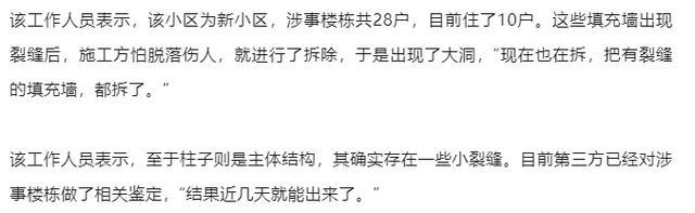 11月5日,潇湘晨报记者致电荣盛张家口公司,工作人员表示,此事不便透露。随后,小区所在的万全区住建局工作人员告诉记者,经现场核查,视频中出现大裂缝、大洞的墙面是填充墙,“里面没有钢筋、混凝土,不是主体结构。”