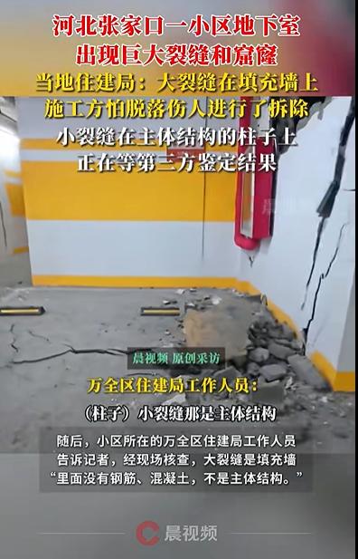 11月4日,网友发视频反映,河北张家口市荣盛城小区地下车库墙面出现大裂缝,担心房屋存在安全隐患。视频显示,该车库墙面、地面、柱子上有多个大裂缝,墙面上还有大洞。