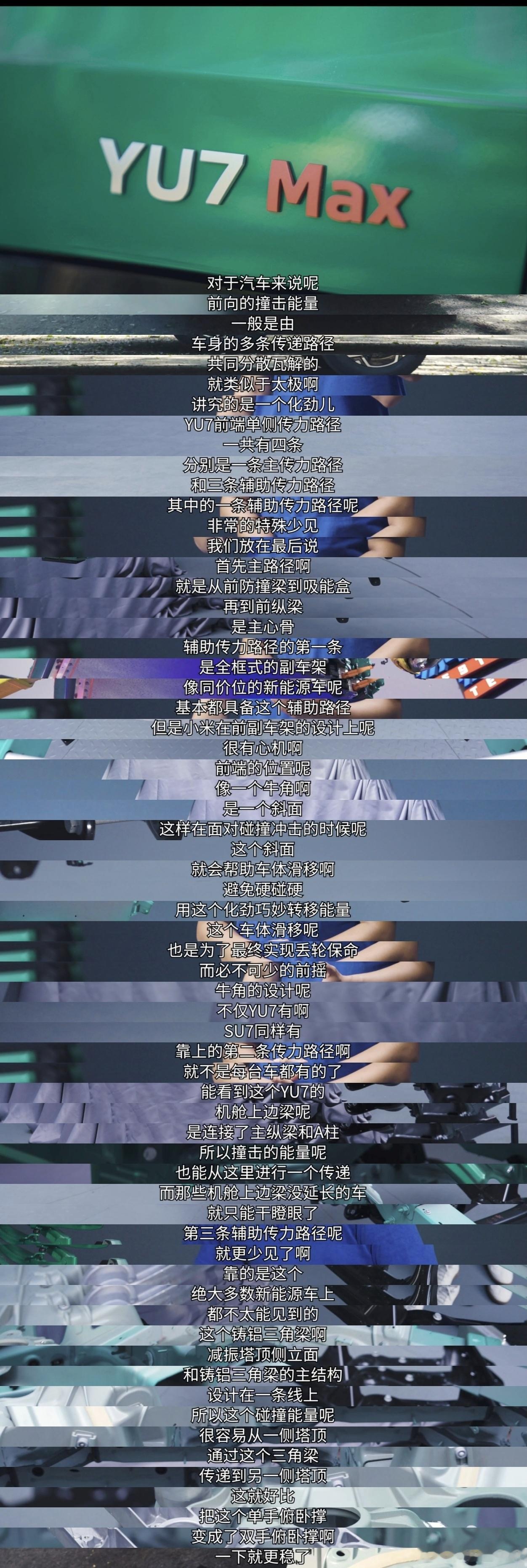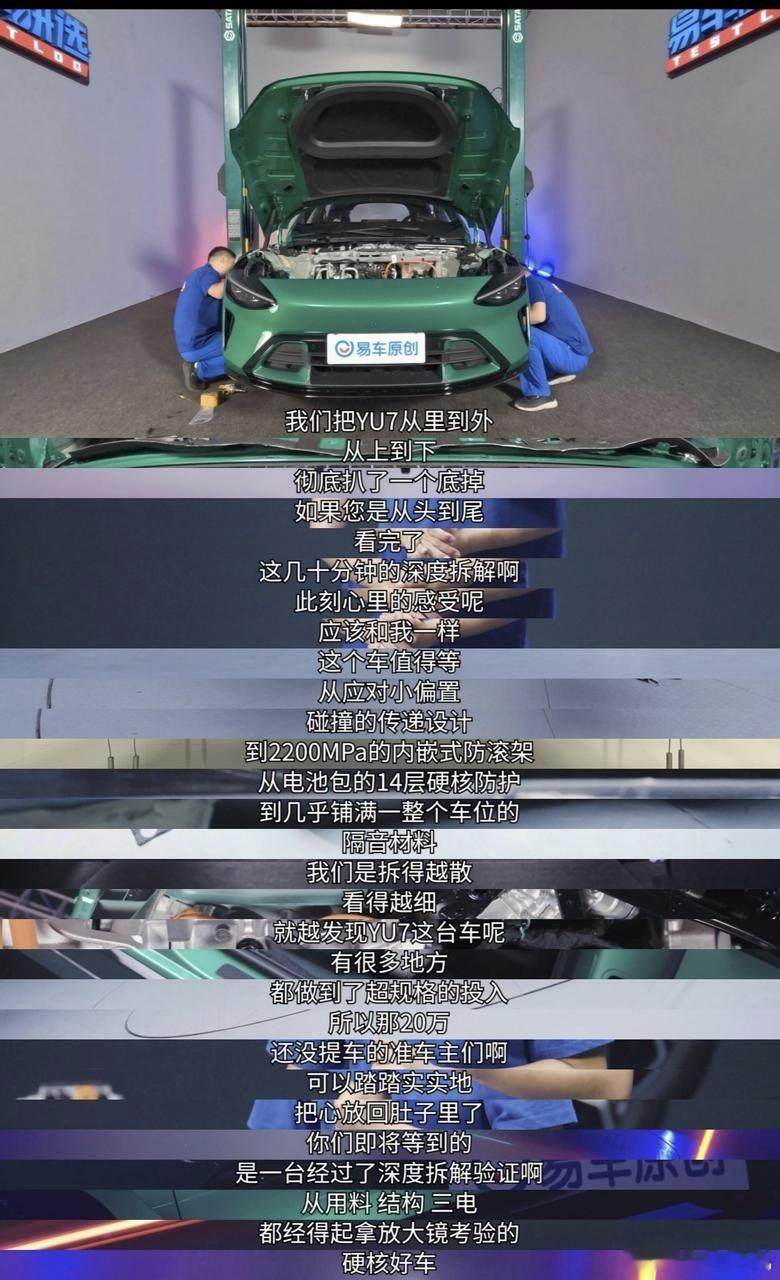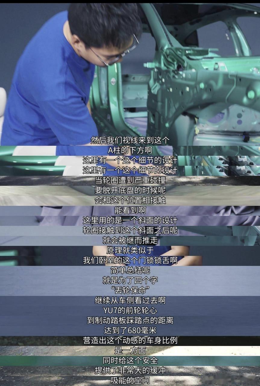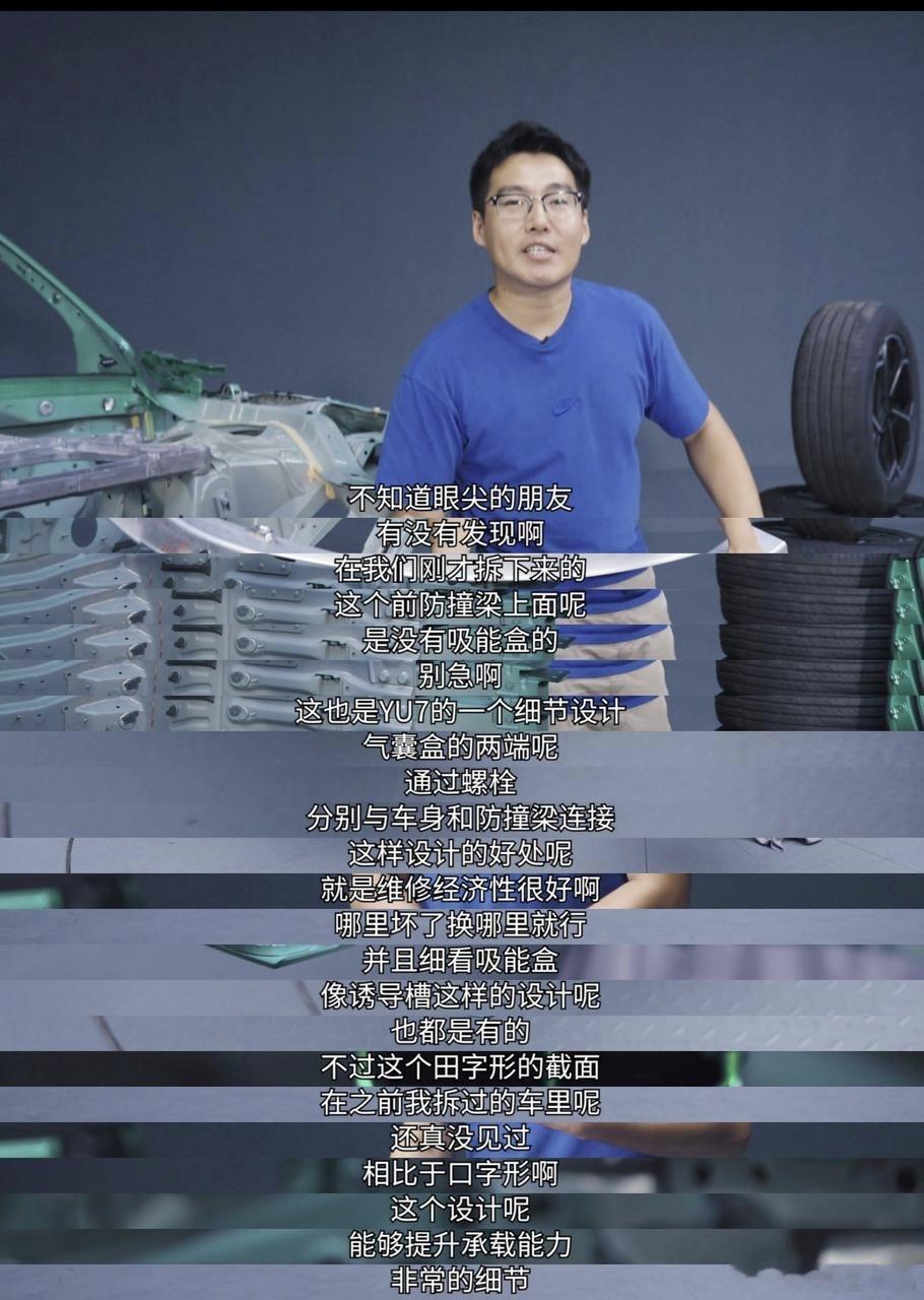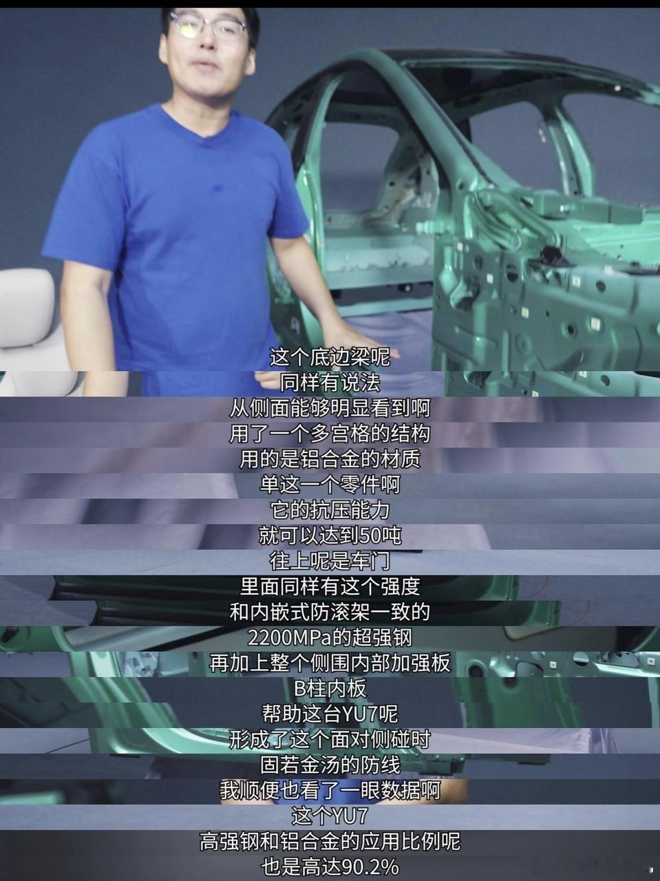 YU7全网首拆来了,整车以安全性能为核心亮点,前防撞梁采用铝合金目字形结构,覆盖率74.4%,搭配田字形诱导槽提升承载;A柱用2200兆帕热成型钢,内嵌防滚架,电池防护达14层及17层高压绝缘,被动安全用料扎实。