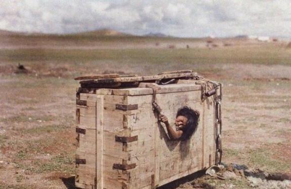 1913年,蒙古一名女子因犯通奸罪被实施“箱刑”,她被剥光衣物,用铁链锁住装进一