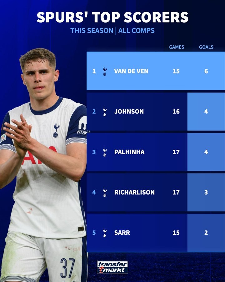 德国转会市场统计了本赛季热刺队内球员的进球数量,并列出榜单,中卫范德芬6球居首。