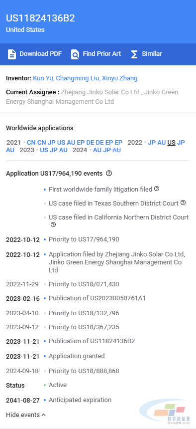 此外,数字新能源DataBM.com注意到,此次涉案专利,与晶科能源此前起诉印度光伏企业WaareeEnergies,以及日本光伏企业VSUNSolarUSA,Inc.和ToyoCo.,Ltd.的案件所涉专利为同一技术。