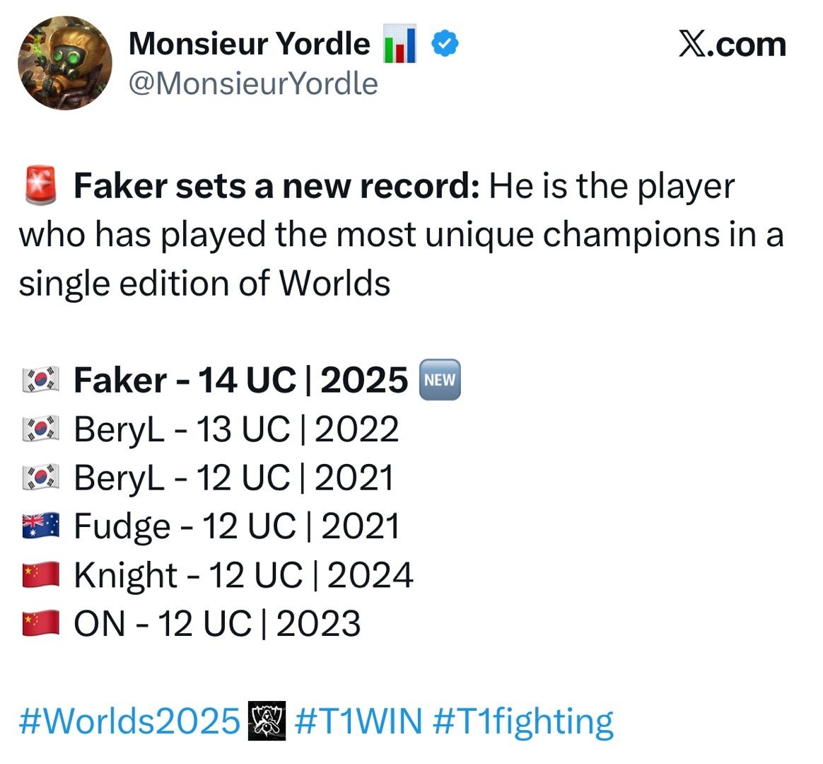 2025入围赛+世界赛期间Faker共使用14个英雄,打破了世界赛中使用英雄数量的记录✍️