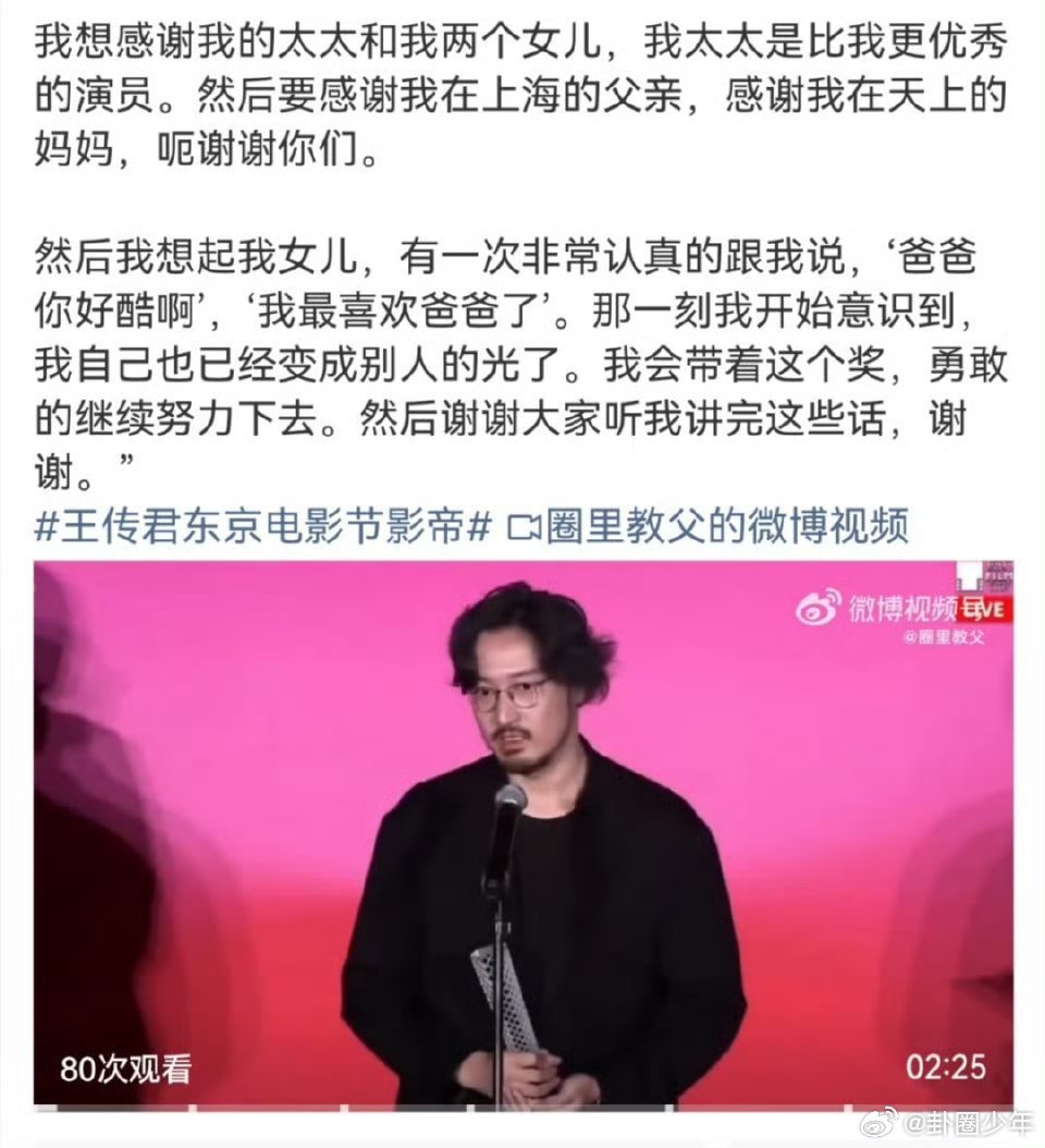 王传君获奖感言文字版 王传君的获奖感言太戳心了!从自我剖白到感恩同行,每一句都藏着对表演的敬畏与温柔,这样真诚又清醒的演员谁不爱不爱!
