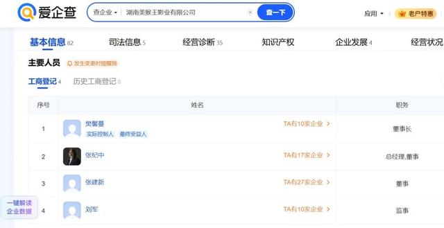 爱企查App显示,湖南美猴王影业有限公司成立于2010年6月,注册资本1000万元,经营范围包括影视策划、影视文化项目投资等,由北京美猴王国文化发展有限公司、山西通宇文化传播有限公司、樊馨蔓(张纪中前妻)共同持股,其中樊馨蔓持股5%。