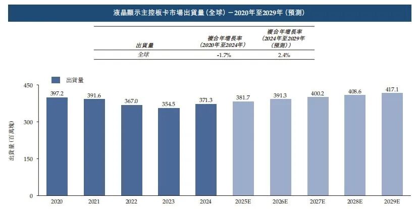 银河证券发布的数据显示,自2018年以来全球平板电视出货量逐年下滑。在此影响下,过去几年全球液晶电视主控板卡出货量出现下滑,弗若斯特沙利文披露的数据显示,2020年全球液晶主控板卡出货量为3.97亿块,2024年下降至3.71亿块。