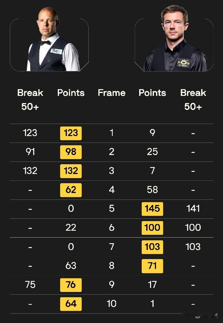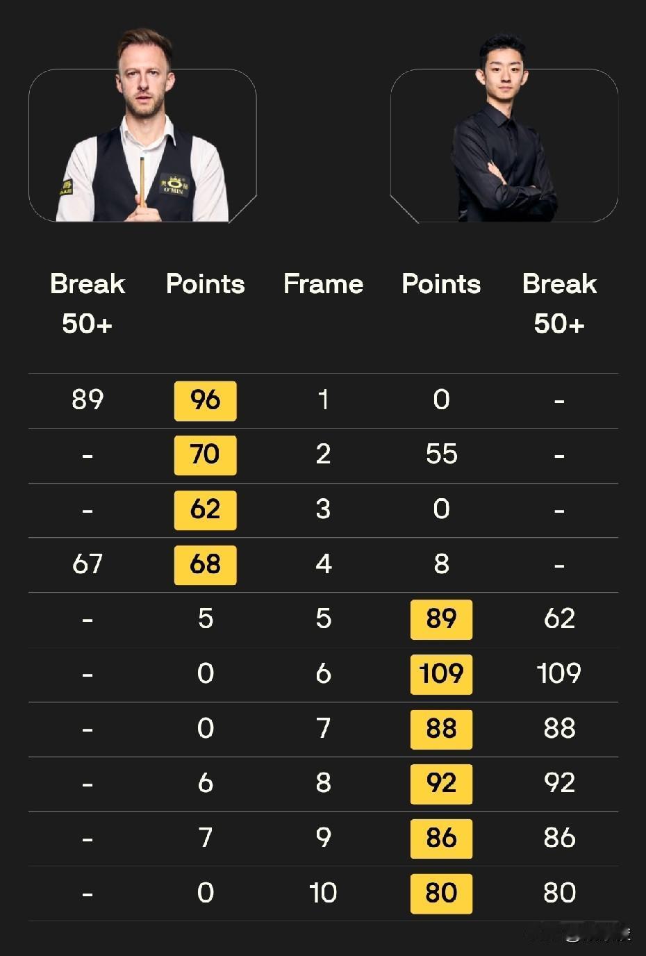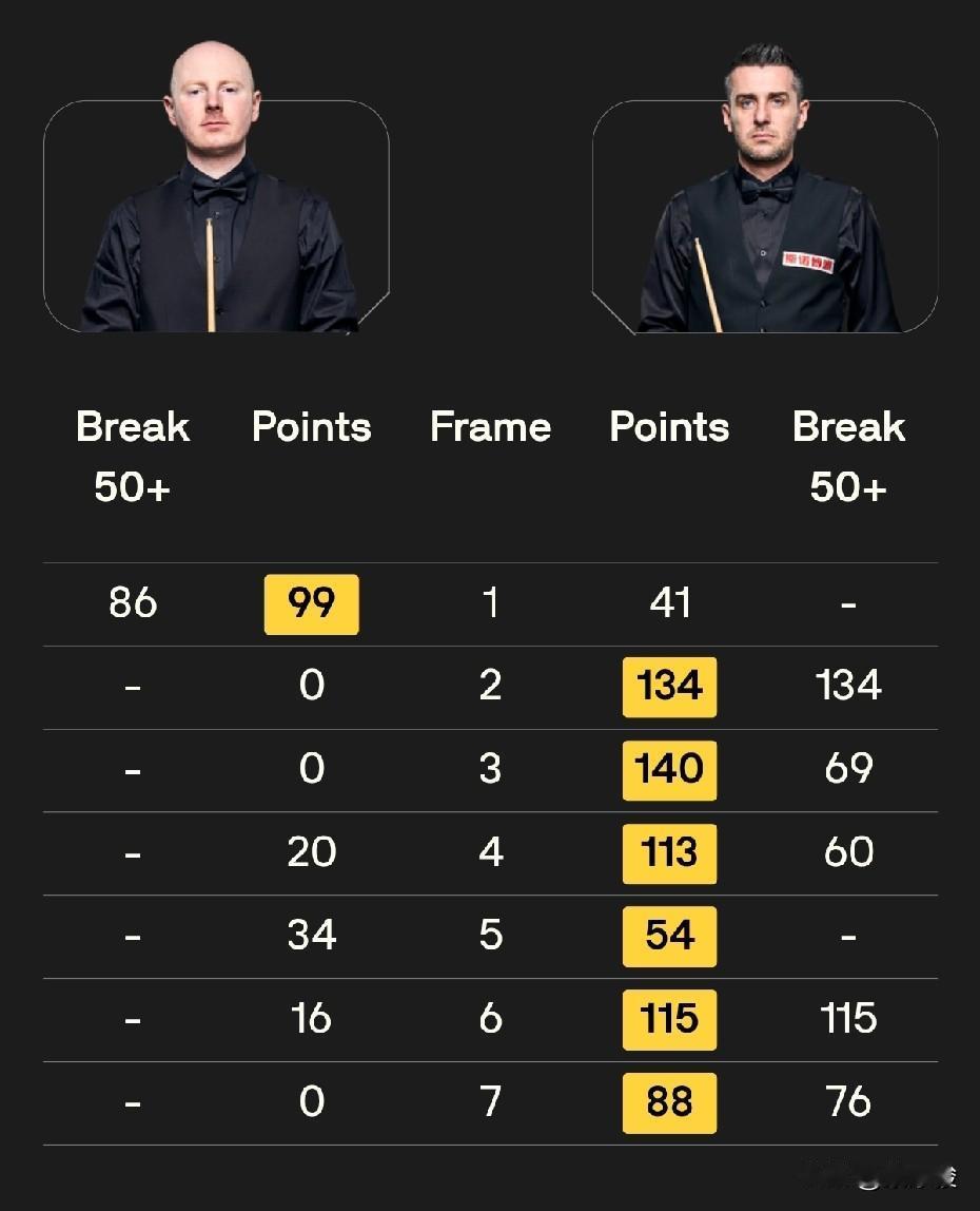 国锦赛8强出4,吴宜泽上演超级逆转,从0-4到6-4,战胜世界第一特鲁姆普。塞尔比6-1大胜麦克吉尔,霍金斯6-4战胜小司机。稍早结束的比赛,赵心童6-1大胜斯佳辉。 让球迷最意外的,当属特鲁姆普与吴宜泽的比赛,吴宜泽0-4落后,之后发起反击,六连鞭小特,6-4上演超级逆转。这场比赛,小吴打出一杆破百、5杆50+。吴宜泽1/4决赛的对手是霍金斯。 霍金斯与小司机的比赛,霍金斯4-0领先,但遭到小司机的顽强抵抗,小司机连赢4局,扳平比分,之后霍师傅连赢两局,6-4锁定胜局。这场比赛,双方一共打出5杆破百,其中小司机3杆,霍金斯2杆。 塞尔比对麦克吉尔也打出较大分差,6-1获胜,塞尔比本场比赛打出2杆破百,1/4决赛将迎战赵心童。 稍早结束的一场中国德比,赵心童6-1大胜斯佳辉,晋级8强。 今天19点30分还将进行4场比赛,争夺另外4个8强席位。最受关注的是丁俊晖与墨菲的对决。另外,江俊将迎战马奎尔。 丁俊晖、江俊,加油!