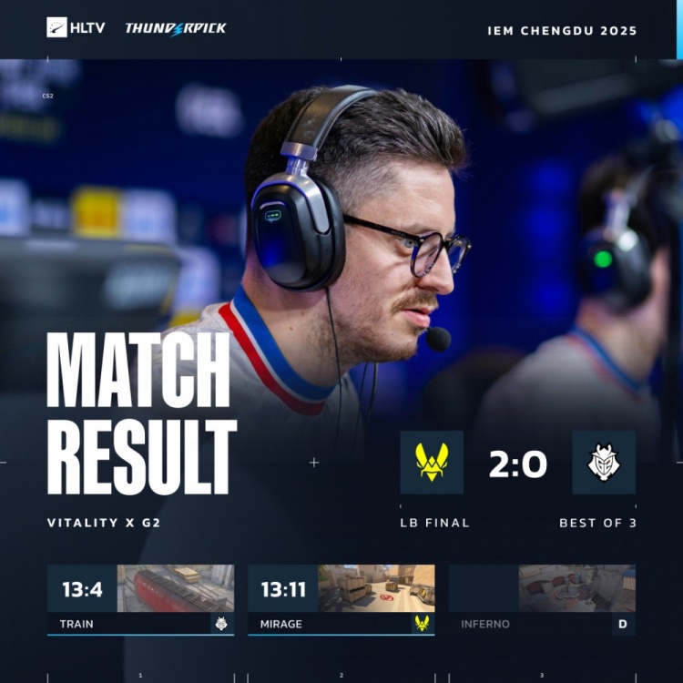 直播吧11月5日讯CS2大赛2025成都IEM站B组败者组决赛,最终Vitality两图横扫G2,晋级淘汰赛,G2则告别本届赛事。