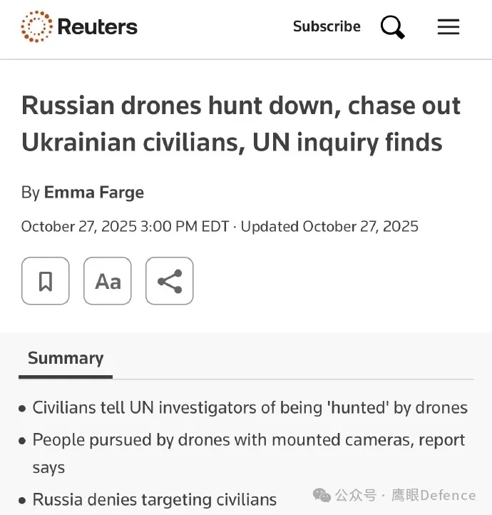 路透社报道称,联合国已正式证实,俄罗斯军队正在使用无人机“猎杀人类”,这是反人类罪,俄军用无人机在前线地区追逐、猎杀平民,目的是将前线城镇的全体平民赶走。