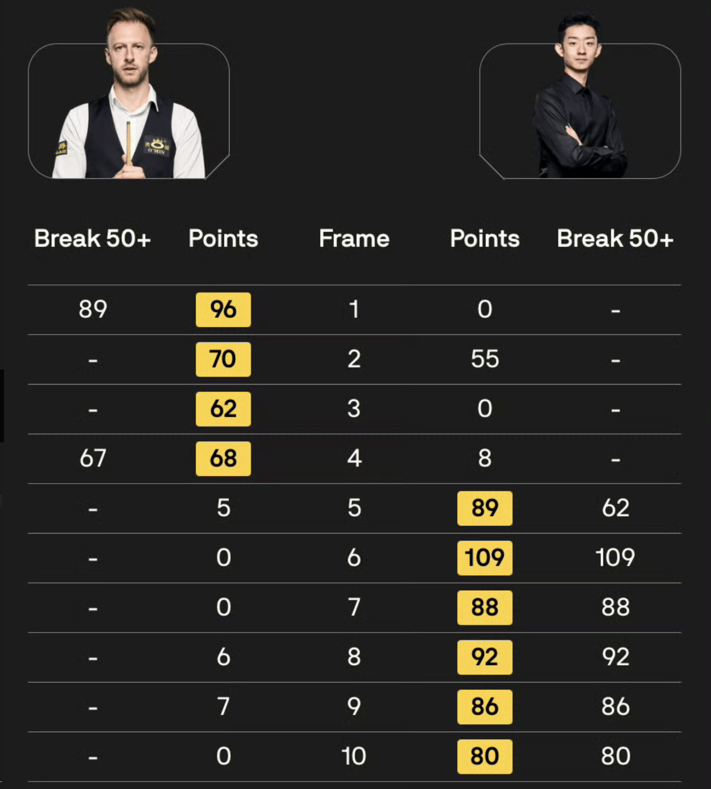 全场比赛,吴宜泽打出一杆109分和五杆50+(62、88、92、86、80),特鲁姆普打出两杆50+(89、67)。最终,吴宜泽6-4逆转战胜特鲁姆普,成功挺进8强。