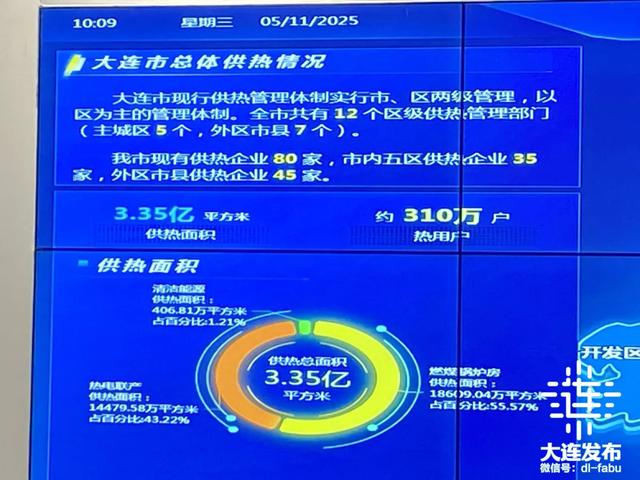 在大连洁净能源集团运行中心,所有的运行参数都在大屏幕上一目了然,2300万平方米供热区域内的240个换热站数据显示,二次网的回水根据地热区和暖气区的不同,温度也从30℃到32℃不等。