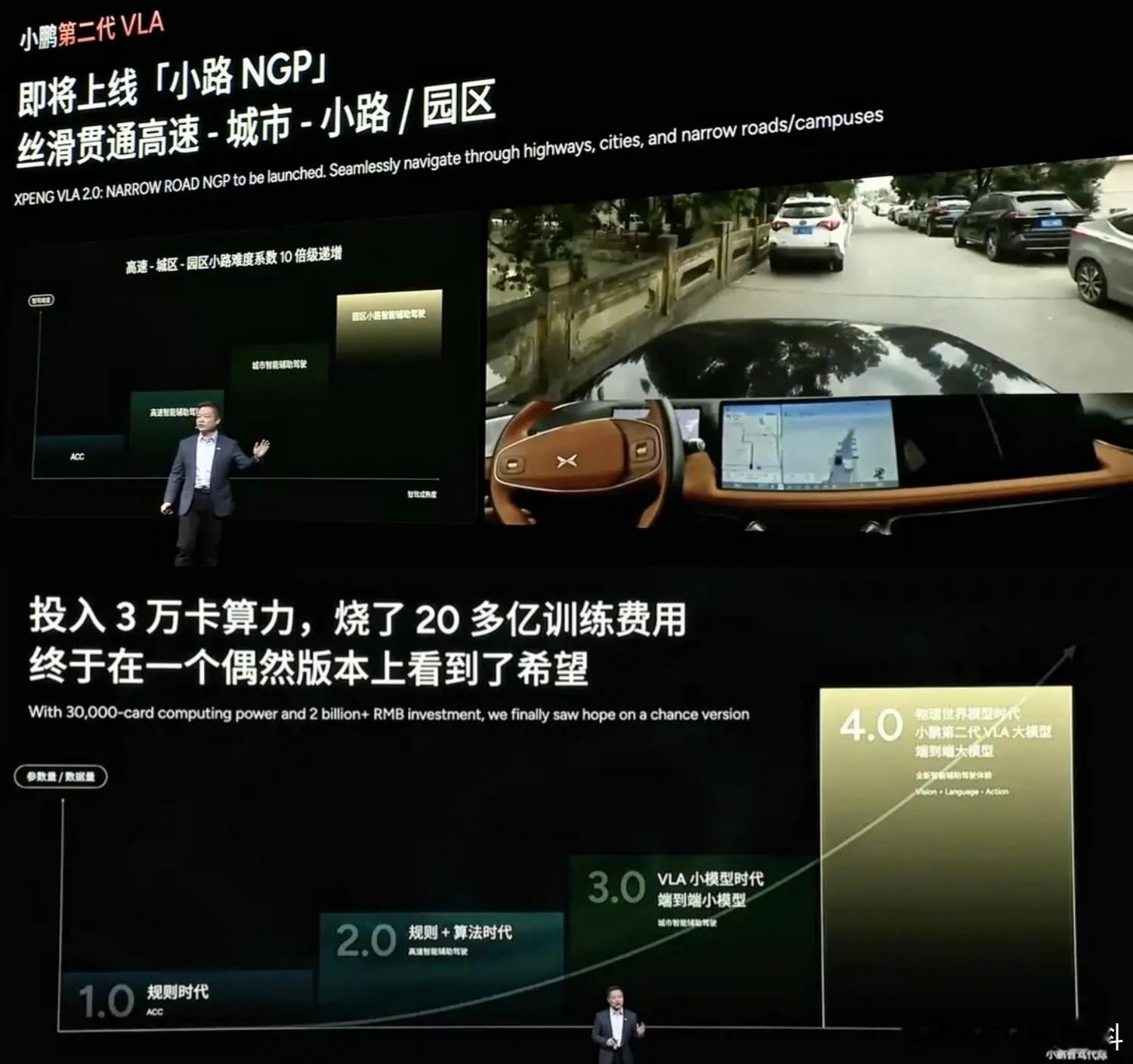 小鹏科技日 发布的第二代VLA,丝滑贯通高速—城区—小路/园区等主要场景,让复杂小路NGP的平均接管里程提升13倍,智能涌现全新能力(识别交警手势、识别红绿灯逻辑提前应对)