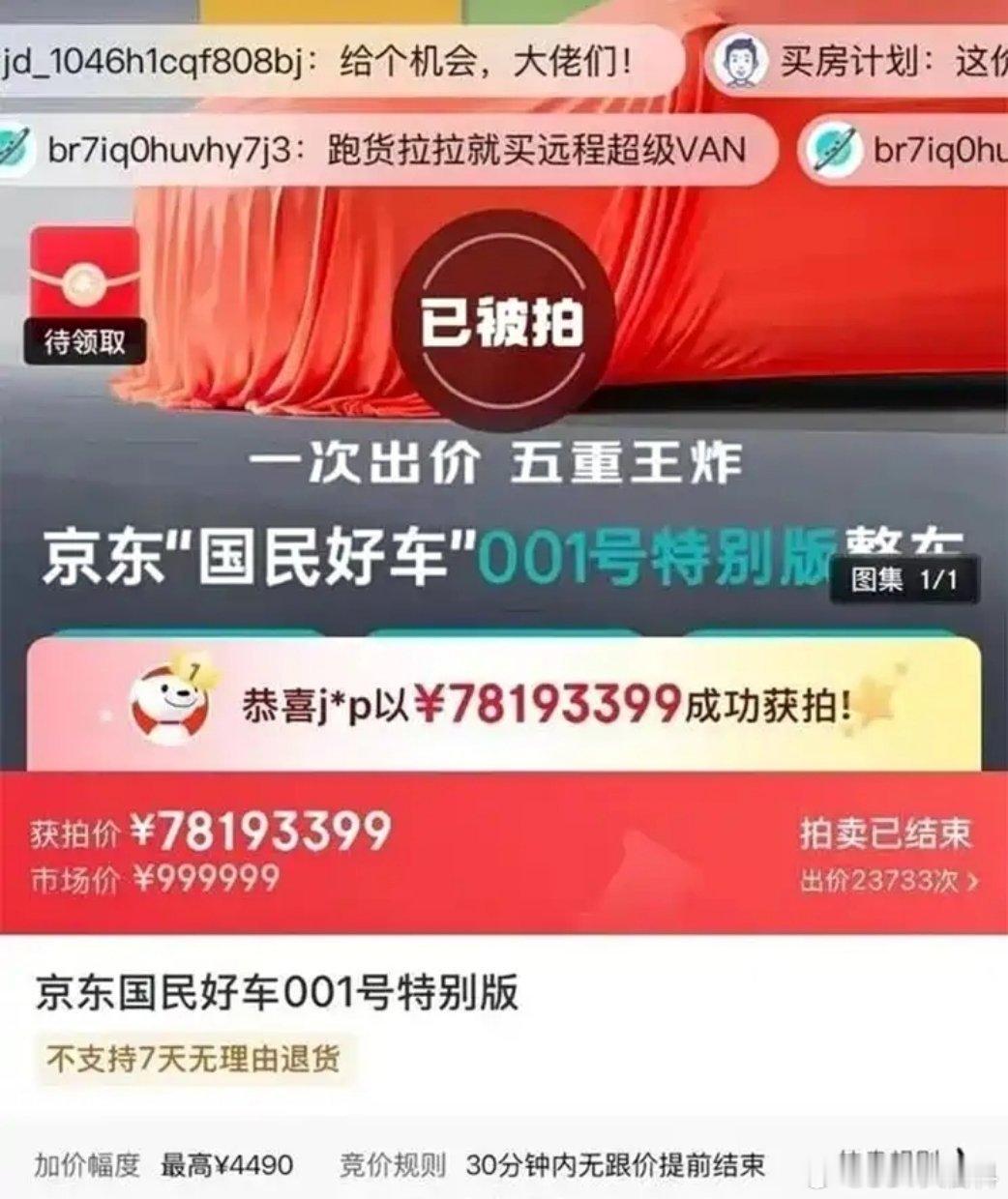 值得一提的是,新车此前在京东进行了首台拍卖,起拍价1元,吸引了超21万人围观,第16分钟拍出1000万元,不到1小时已达2500万,最终以7819.3399万成交