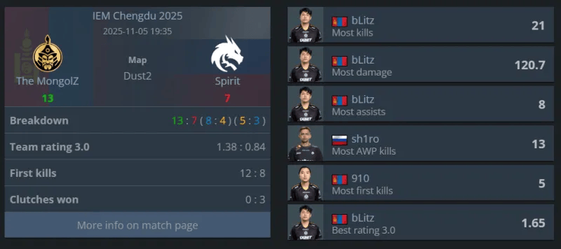 虎扑11月05日讯IEM成都A组败决,Spirit对阵TheMongolZ结束,Spirit2-1TheMongolZ:惨淡收场,Spirit止步八强
