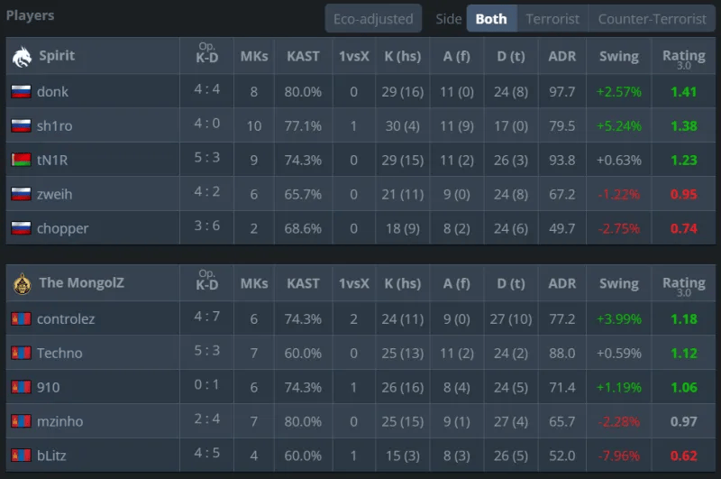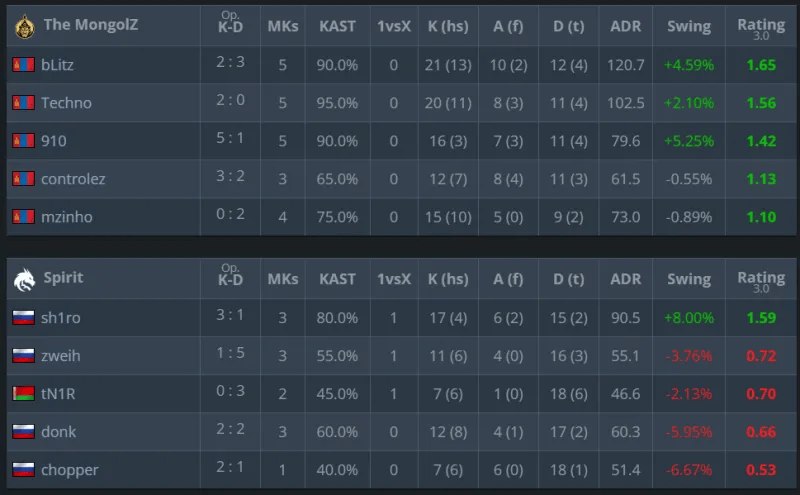 进入加时,spirit选择速提A区,夺取A区并下包后成功守包拿下一分。随后进入暂停时间。暂停回来,donk匪口对枪失败掉点,TheMongolZ再次扳平比分。上半场TheMongolZ防守取得两分。加时赛现场,绿龙及时回防B区扑灭TheMongolZ速提攻势,比分再次回归同一起跑线。第二十九局,910残局一打二成功再次取得领先。第三十局,sh1ro大狙三杀帮助绿龙再次将比赛拖入第二个加时。
