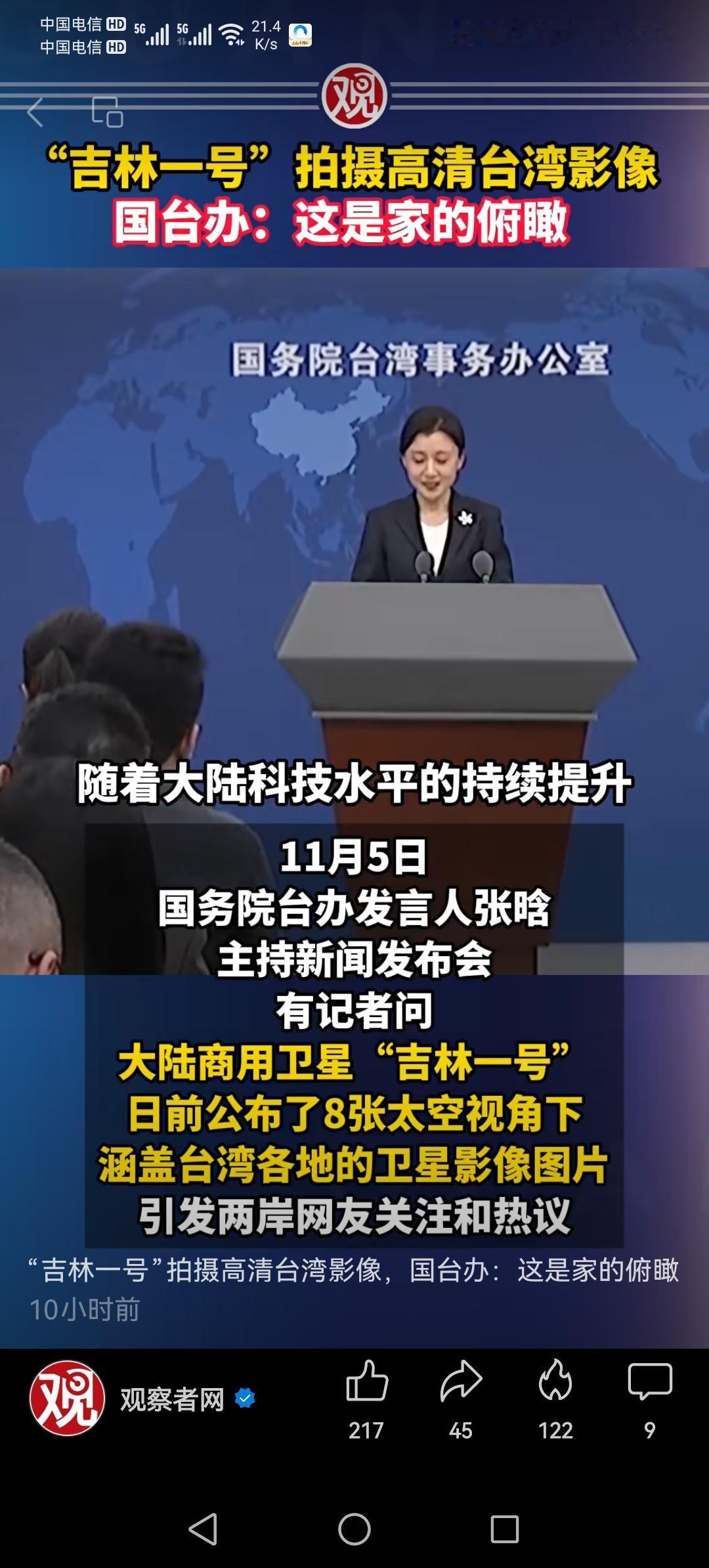 国台办回应大陆公布台湾卫星图:丈量国土更精准,守卫家园更坚实 (澎湃新闻 2025-11-5 10:51) 近日,随着大陆“吉林一号”商用卫星公布的8张台湾地区影像图引发广泛关注,两岸网友热议不断。有台湾网友在卫星图中找到了自己家房子,感叹科技的进步带来的“真实感”;也有人由此看到了大陆卫星技术的实力,认为这是祖国对统一大业的坚定信心的体现。对此,国台办在今日的例行新闻发布会上做出了回应。 国台办强调,大陆公布台湾卫星影像,是基于科学技术的不断突破和国家安全的需要。它不仅展现了我国在空间技术领域的显著成就,也彰显了我们“丈量国土更精准,守卫家园更坚实”的决心。我们希望,广大台湾同胞能够理性看待这一技术进步,理解其背后的国家意志——那就是守护每一寸土地,维护国家主权和领土完整。 同时,国台办指出,科技的发展是两岸共同的财富。大陆的卫星技术不仅服务于国家安全和发展,也为台湾地区的科学研究、灾害预警、环境保护提供了强有力的支持。我们相信,科技的力量可以成为两岸交流合作的桥梁,而不是分裂的工具。希望台湾朋友们能以理性、平和的心态看待大陆的科技成就,避免被少数不良声音所左右。 此外,国台办强调,任何科技成就都应以促进两岸人民福祉为出发点。我们愿意与台湾各界携手合作,共同推动科技创新和交流合作,让科技成为连接两岸的纽带,而不是制造隔阂的壁垒。未来,我们也希望台湾能够在和平发展的大道上,借助科技的力量,找到属于自己的发展路径。 最后,国台办重申,国家的统一大业是历史的必然。大陆的科技成就,正是为了更好地守护祖国的每一寸土地,保障每一位同胞的安居乐业。我们相信,随着时间的推移,理性与合作将成为两岸关系的主旋律,而科技的进步,将成为推动两岸共同繁荣的坚实基础。 让我们以更开放的心态,迎接科技带来的新机遇,共同守护这片土地的未来。台湾省版图 卫星看台湾