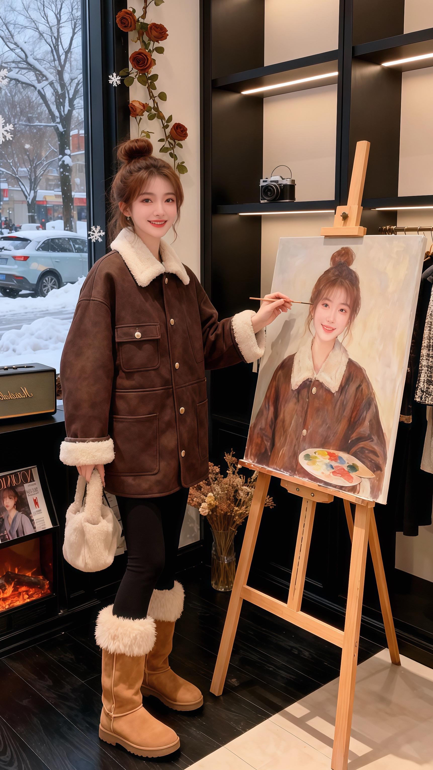 她有两个“怪癖”:爱穿带毛领的咖色外套,还总在店里支着画架。路过的人常看见她,要么对着人体模特的穿搭调色,要么抱着画板,把窗外的雪、进店的客,都揉进颜料里。
