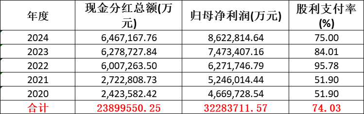 作为A股“白马股”代表,贵州茅台长期保持大手笔现金分红传统。东财Choice数据显示,2020年—2024年,贵州茅台现金分红合计2389.96亿元,占同期公司归母净利润总和的74%。
