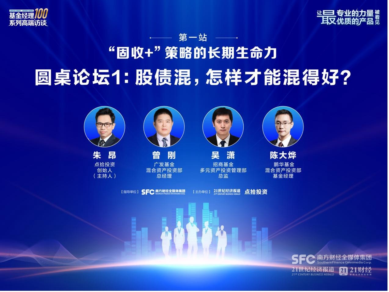 在“股债混,怎样才能混得好?”为主题的首场圆桌讨论中,由点拾投资创始人朱昂担任主持人,广发基金混合资产投资部总经理曾刚、招商基金多元资产投资管理部总监吴潇、鹏华基金混合资产投资部基金经理陈大烨三位风格鲜明、经验丰富的基金经理,围绕如何优化风险收益比、追求实现绝对收益目标、应对市场变化以及与量化结合等关键问题,展开了坦诚而富有洞见的分享。