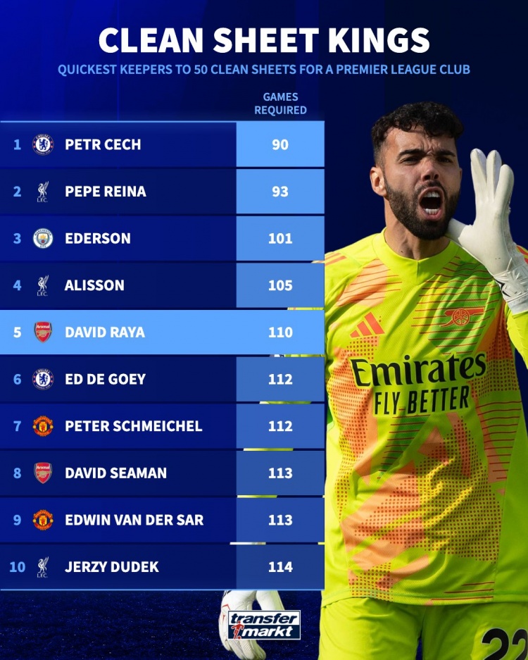 直播吧11月6日讯阿森纳在欧冠客场3-0击败布拉格斯拉维亚,拉亚完成了阿森纳生涯的第50场零封,共计用了110场比赛,排名英超俱乐部门将50场零封第五快。