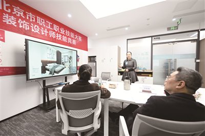 11月5日,由北京市总工会、北京市人力资源和社会保障局主办,北京金隅集团股份有限公司工会,北京市总工会职工服务中心、北京市职工技术协会承办的2025年北京市职工职业技能大赛室内装饰设计师技能竞赛决赛在金隅龙顺成文化创意产业园圆满落幕。来自北京市的31名选手参加比赛,此次竞赛是2025年北京市职工职业技能竞赛30个赛项之一。图为参赛选手正在向评委介绍自己的设计理念。