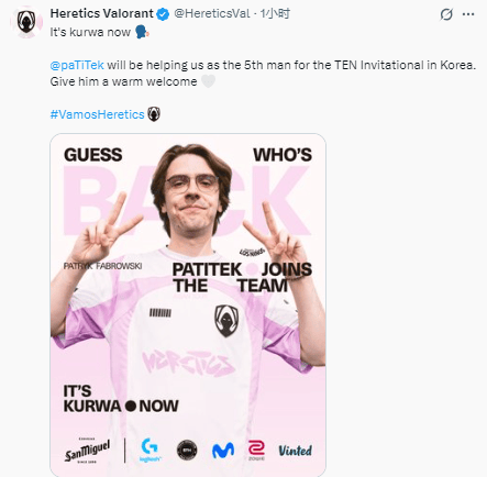 "paTiTek将作为第五人加入我们来打韩国举行的TEN邀请赛。请热烈欢迎他吧。"
