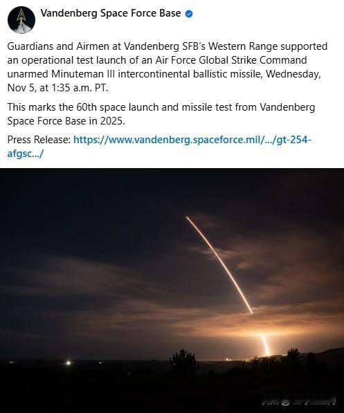 突发:美国发射了一枚洲际核导弹。太平洋时间11月5日星期三凌晨1:35,美国空军全球打击司令部在范登堡空军基地西部靶场进行了一次民兵III洲际弹道导弹的实战试射,但导弹没有携带弹头。 这是2025年范登堡太空部队基地的第60次发射。