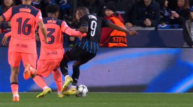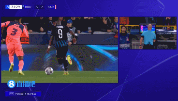 直播吧11月06日讯欧冠第4轮布鲁日vs巴萨,第72分钟,博尔赫斯拿球杀入禁区,在巴尔德防守下倒地,主裁判泰特第一时间判罚点球,但随后亲自看过VAR后取消了点球的判罚!