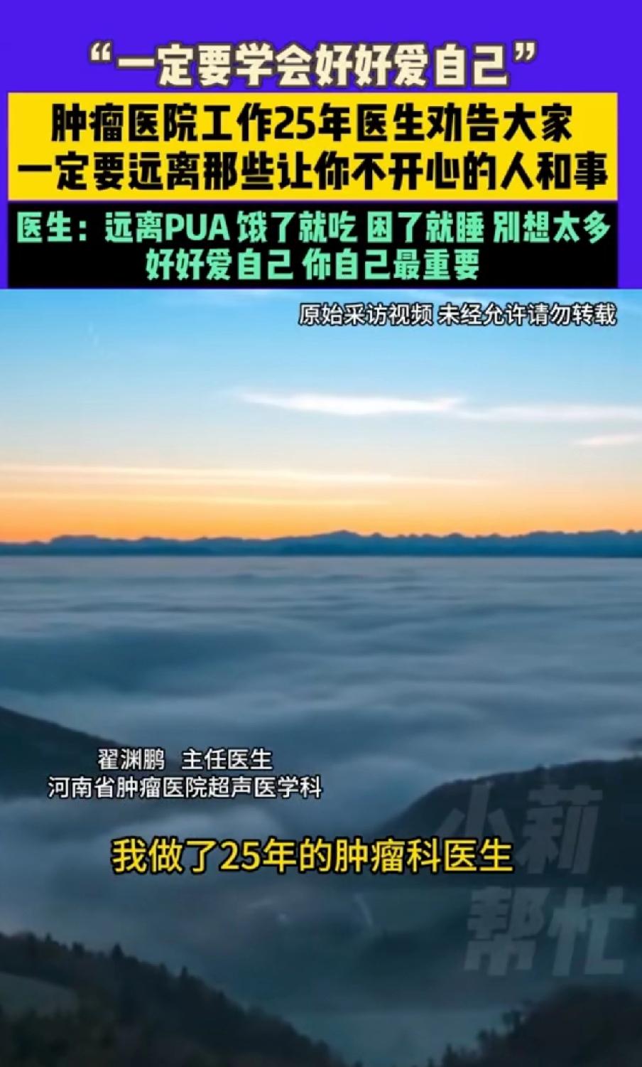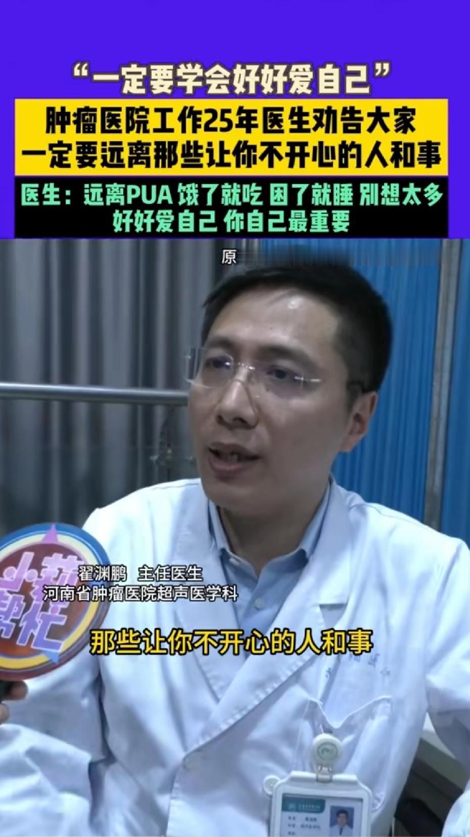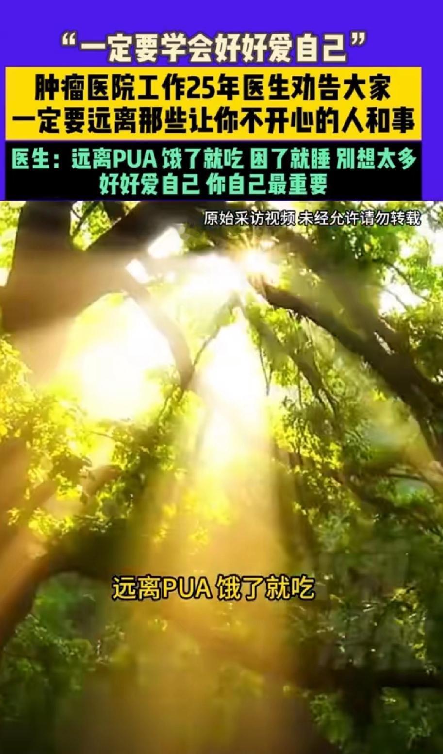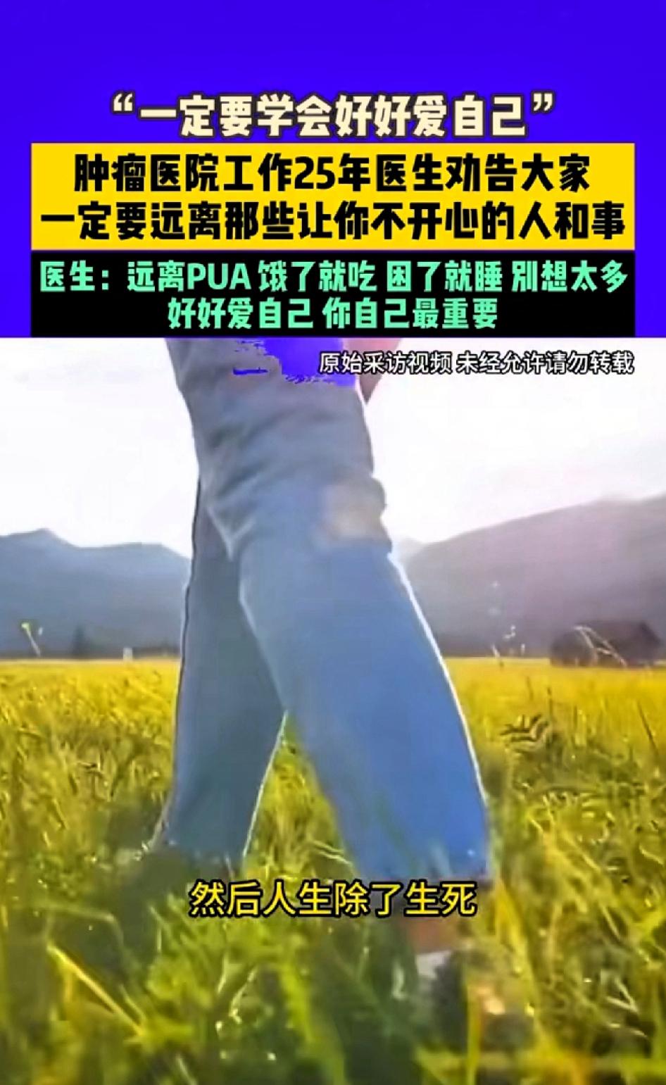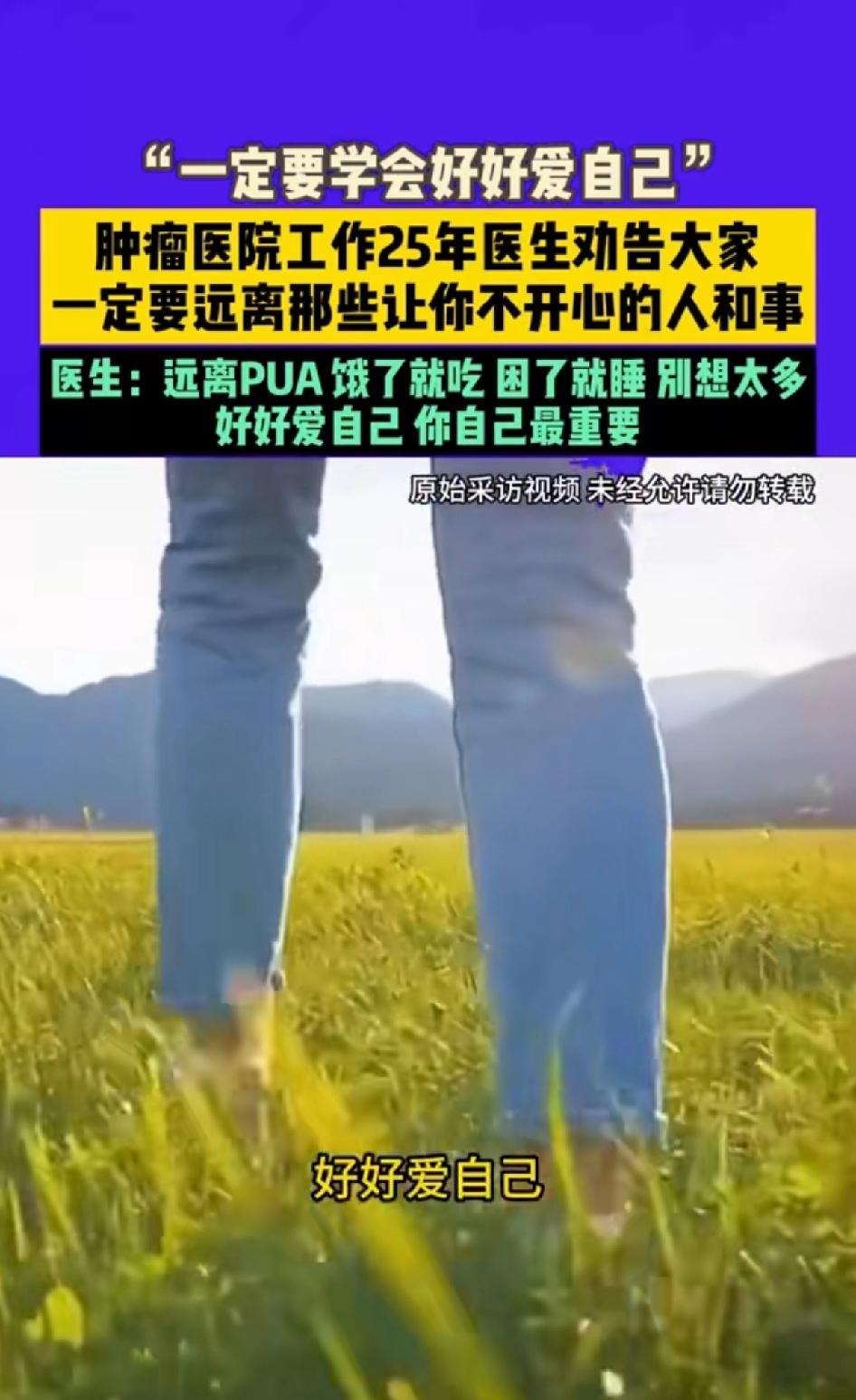 “一定要好好爱自己”,肿瘤医院25年的医生劝告大家,一定要远离那些让你不开心的人和事!生活中糟心的事很多,想办法远离! 医生告诉大家远离PUA饿了就吃,困了就睡 别想太多,好好生活,好好爱自己,自己才是最重要的! 如果自己没了,这个世界也不存在了。不要让现在和未来的事内耗自己,让自己有快乐的能力! 人生除了生死,其他都是小事。 肿瘤医生见惯了生死,对生活看的很透彻,想想他说的话多有道理! 除了生死,都是小事,开心快乐最重要。 人的痛苦除了疾病带来的,然后就是因为自己的贪欲所带来的。 总是得到了还想要更多,永远都不满足,有了房子还会想要更大的,位置更好的! 钱越多越好,车子越值钱越好!总是欲大于求,贪欲像个无底洞!掌控着不快乐的人,如果能摆脱它,我想每个人脸上都会洋溢着幸福的笑容。