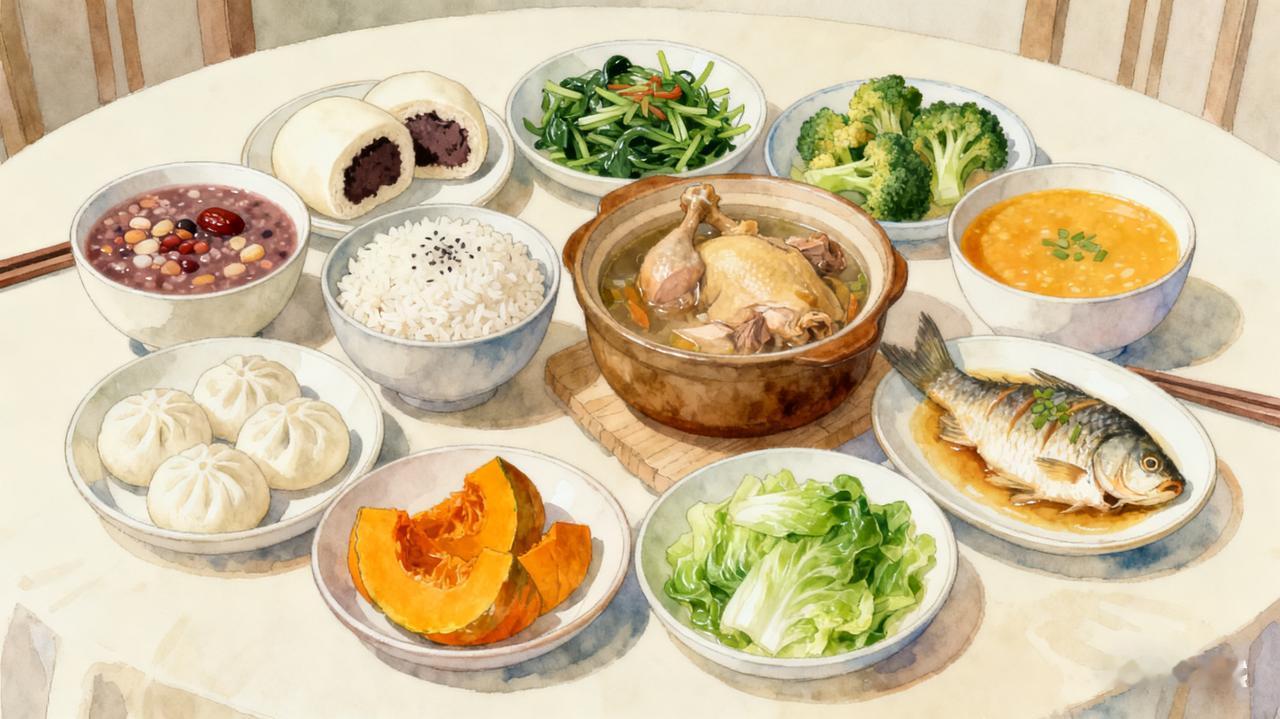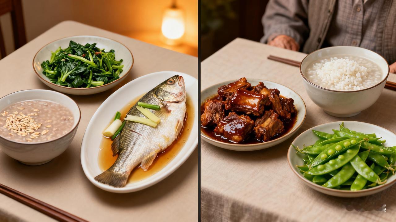 老年人深秋一周养生食谱(含食材用量+烹饪步骤) 周一 早餐:小米粥、蒸山药、水煮蛋 - 食材用量:小米50g、山药150g、鸡蛋1个、清水适量 - 烹饪步骤: 1. 小米淘洗干净,加5倍清水大火煮沸后转小火慢熬20分钟至黏稠。 2. 山药去皮切滚刀块,放入蒸锅中蒸15分钟至用筷子可轻松戳透。 3. 鸡蛋冷水下锅,水沸后煮8分钟,捞出过凉水剥壳即可。 午餐:杂粮饭、清炖羊肉汤、清炒西兰花 - 食材用量:大米30g、小米20g、燕麦10g、羊肉200g、白萝卜100g、姜片3片、西兰花200g、蒜末2瓣、盐、生抽少许 - 烹饪步骤: 1. 杂粮淘洗干净,提前浸泡30分钟,放入电饭煲加水煮熟(水比平时蒸米饭略多)。 2. 羊肉切块冷水下锅,加1片姜片焯水去血沫,捞出洗净;将羊肉、剩余姜片、足量清水放入砂锅,大火煮沸后转小火炖1小时,加入切好的白萝卜块再炖20分钟,加盐调味即可。 3. 西兰花掰小朵,焯水30秒捞出;锅中放少许油,爆香蒜末,放入西兰花翻炒2分钟,加少量生抽和盐调味出锅。 晚餐:燕麦粥、清蒸鲈鱼、凉拌菠菜 - 食材用量:燕麦片50g、鲈鱼1条(约300g)、菠菜200g、姜片2片、葱段、盐、香油少许 - 烹饪步骤: 1. 燕麦片加6倍清水,大火煮沸后转小火熬15分钟至浓稠。 2. 鲈鱼处理干净,在鱼身划两刀,姜片、葱段放在鱼身及鱼腹内,淋少许盐腌制10分钟;蒸锅水沸后放入鲈鱼,大火蒸12分钟,出锅淋少量香油。 3. 菠菜焯水1分钟捞出过凉水,挤干水分切段,加少许盐和香油拌匀即可。 周二 早餐:南瓜粥、全麦馒头、凉拌海带丝 - 食材用量:大米50g、南瓜100g、全麦馒头1个、干海带丝20g、盐、醋、香油少许 - 烹饪步骤: 1. 大米淘洗干净,南瓜去皮切块,一同放入锅中,加足量清水大火煮沸后转小火熬20分钟至南瓜软烂、粥黏稠。 2. 全麦馒头放入蒸锅中蒸5分钟加热即可。 3. 干海带丝用温水泡发30分钟,焯水2分钟捞出过凉水,加少许盐、醋和香油拌匀。 午餐:红薯饭、番茄炖牛腩、蒜蓉油麦菜 - 食材用量:大米40g、红薯100g、牛腩200g、番茄2个、姜片2片、油麦菜200g、蒜末2瓣、盐、生抽少许 - 烹饪步骤: 1. 大米淘洗干净,红薯去皮切块,一同放入电饭煲,加水煮熟。 2. 牛腩切块冷水下锅焯水去血沫,捞出洗净;锅中放少许油,爆香姜片,放入牛腩翻炒2分钟,加入切块的番茄翻炒出汁,加足量清水大火煮沸后转小火炖1.5小时,加盐调味即可。 3. 油麦菜洗净切段,锅中放少许油,爆香蒜末,放入油麦菜翻炒1分钟,加少量生抽和盐调味出锅。 晚餐:大米粥、红烧排骨、清炒荷兰豆 - 食材用量:大米50g、排骨200g、荷兰豆150g、姜片2片、葱段、盐、生抽、老抽少许 - 烹饪步骤: 1. 大米淘洗干净,加足量清水大火煮沸后转小火熬20分钟至黏稠。 2. 排骨切块冷水下锅焯水去血沫,捞出洗净;锅中放少许油,爆香姜片、葱段,放入排骨翻炒至表面微黄,加生抽、老抽翻炒上色,加足量清水大火煮沸后转小火炖40分钟,加盐调味收汁即可。 3. 荷兰豆去筋洗净,锅中放少许油,放入荷兰豆翻炒3分钟,加少量盐调味出锅。秋冬养生食谱 老年人营养食谱