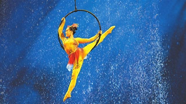 《水秀》演出现场,杂技演员在表演《水中吊环》节目。僧少琴摄