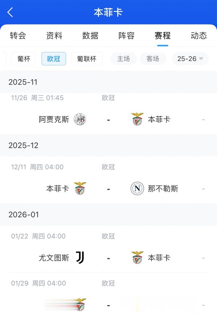 接下来欧冠四场,本菲卡还将面对包括那不勒斯、尤文及皇马。只有阿贾克斯与本菲卡处境类似,两队都四连败。