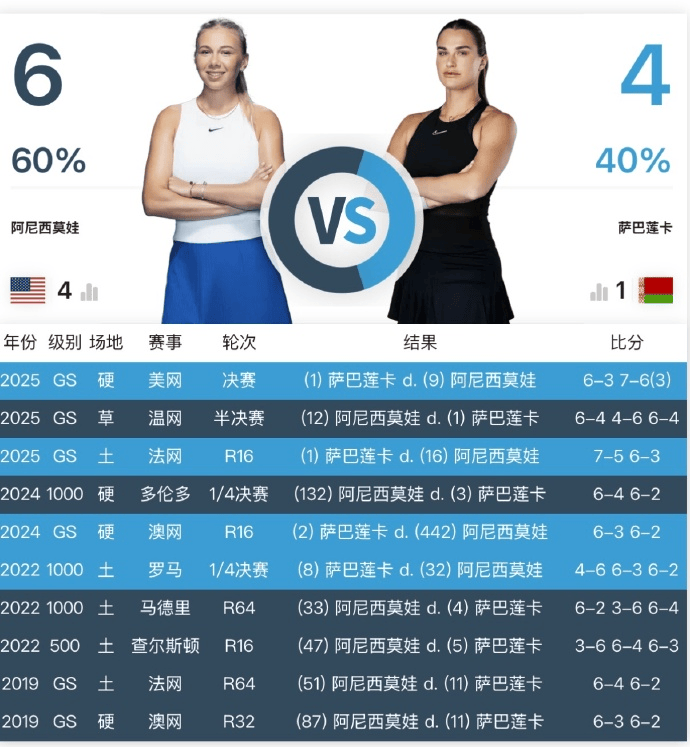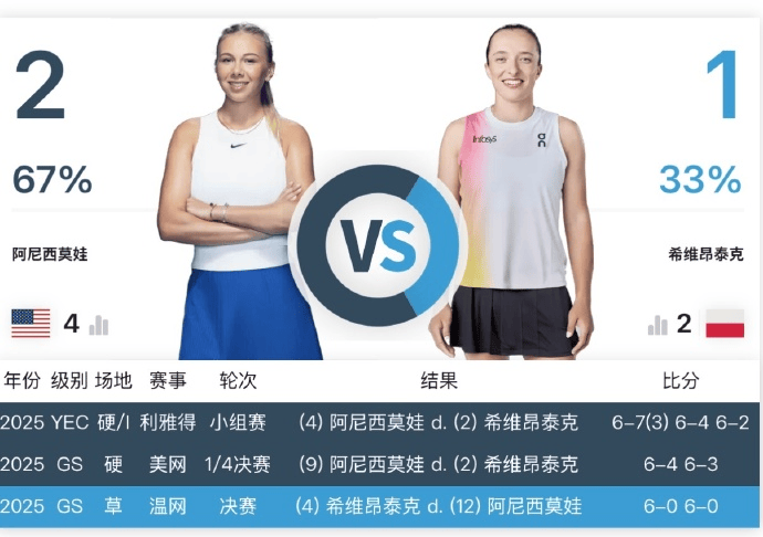 这是阿尼西莫娃继美网之后再次战胜斯瓦泰克,将双方的交手记录改写为2-1领先。