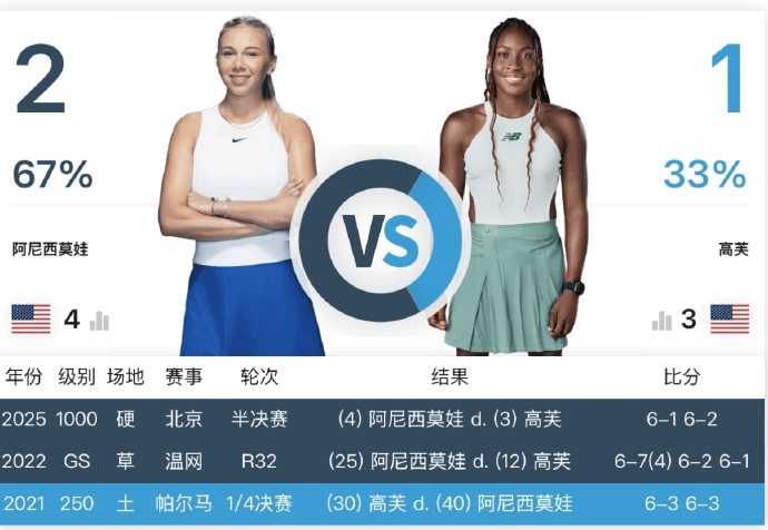 值得一提的是,阿尼西莫娃对世界第一萨巴伦和世界第三高芙的交手记录也都是领先。