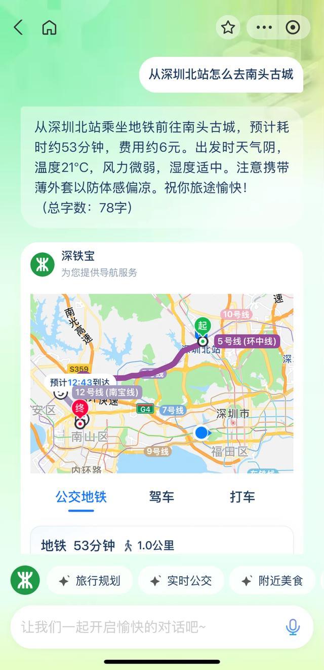 “区别于传统出行工具的机械问答,AI深铁宝依托千亿参数语义理解能力,实现一句话直达,秒级响应的自然对话体验。”深铁集团的相关负责人介绍,基于此智能交互能力,作为出行助手,AI深铁宝可提供出行“前中后”全流程服务。