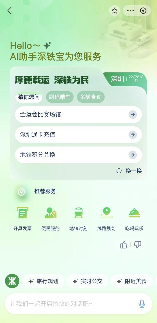 从行前线路规划、时刻查询与交通卡充值,到途中刷码乘车与便民服务,再到行程结束后的发票开具,形成智慧出行服务闭环。作为深圳向导,它不仅提供旅行攻略、商圈指引、美食与酒店推荐,还能解读深圳历史文化,洞察“十五运会”等本地热点,是一位真正“懂出行、更懂深圳”的智能向导。