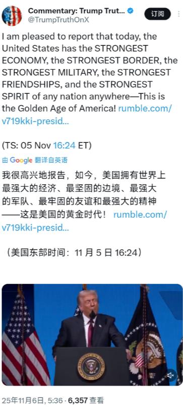 特朗普今天(北京时间11月6日)表示:“我很高兴地报告,如今,美国拥有世界上最强大的经济、最坚固的边境、最强大的军队、最牢固的友谊和最强大的精神 -这是美国的黄金时代!” 特朗普大言不惭宣称美国迎来“黄金时代”,拥有最强大种种。可现实呢?美国政府关门创下历史纪录,国内矛盾重重,民生问题堆积如山。 所谓“黄金时代”不过是其自吹自擂的幻影,在政府停摆的闹剧下,这番空洞言论显得无比荒诞可笑。 先说说特朗普口中“最强大的经济”,2025年8月的数据狠狠打了脸。美国劳工统计局公布的消费者价格指数环比上涨0.4%,年通胀率攀升至2.9%,这是今年1月以来的最高水平。 老百姓去超市采购,感受最直接。食品价格单月飙升0.6%,创下近三年最大涨幅。油价在7月短暂下跌后强势反弹,环比上涨1.9%。 日常开销越来越大,工资却跟不上节奏。8月名义工资虽有小幅上涨,但实际工资剔除通胀后只涨了0.7%,这是一年多来的最低水平。 经济学家都直言,老百姓根本感受不到工资增长,只知道东西越来越贵。就业市场更暗藏隐忧。 截至9月6日的一周,首次申请失业救济人数增加2.7万人,达到26.3万人,创下2021年10月以来的最高值。裁员增加、新增就业放缓,这些信号都在预示经济增长的压力。 经济之外,特朗普吹的“最坚固的边境”也站不住脚。2月曾有数据说南部边境非法移民越境数量同比下降94%,但现实执法压力丝毫没减。 就在11月5日,ICE休斯敦办事处刚结束一场为期10天的突击行动,累计逮捕人数超过1500人。 这个数字看似不多,但日均逮捕人数已经高于华盛顿特区、芝加哥等城市的同类行动。边境巡逻队队员每天都在高强度工作,所谓“坚固”更像自欺欺人。 盟友关系更谈不上“最牢固”,美欧这对老伙伴现在裂痕越来越深。特朗普指责欧洲贸易上“占美国便宜”,直接对欧盟钢铝产品加征关税。 欧盟立刻反制,对价值260亿欧元的美国商品加税。特朗普还不依不饶,威胁要对欧盟酒类产品征收200%的关税。 安全领域的矛盾更突出,美国要求欧洲国家将军费开支提升至GDP的5%,德国直接拒绝了。德国国防部长算过账,这个比例相当于联邦预算的40%,约2000亿欧元,根本无力承担。 价值观上的分歧也摆上台面。美国副总统万斯在慕尼黑安全会议上公开批评欧洲的移民政策和堕胎立场,马斯克还在自己的平台上力挺德国极右翼政党。欧洲多国都对美国产生了强烈的不信任感。 所谓“最强大的军队”也藏着隐忧,美国国防开支占GDP的比重从冷战时期的6%以上降到了如今的约3%。国债负担不断增加,让军队在装备更新、技术研发和全球驻军维持之间难以平衡。 更关键的是盟友不愿再配合。欧洲国家虽然提升了防务支出,但远没达到美国的要求,双方在军事合作上的分歧越来越大。 至于“最强大的精神”,普通民众根本没体会到。大家每天被生活压力裹挟。有人担心工作保不住,毕竟裁员潮正在蔓延。 有人发愁下个月的房租,住房开支一直是推高通胀的主力。还有人算计着加油钱,油价反弹让通勤成本又涨了一截。经济学家已经预判,接下来几个月通胀可能会继续加剧。 特朗普嘴里的“黄金时代”,更像一场自导自演的骗局。经济面临通胀和就业的双重打击。边境执法压力持续存在。盟友关系降到冰点。军队发展受限于财政压力。老百姓的生活只觉得越来越难。这些现实摆在眼前,再响亮的口号也掩饰不住内里的空虚。