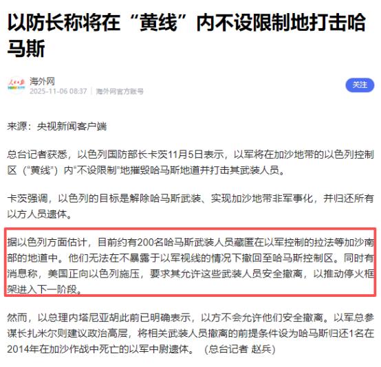 以军控制区还有200名哈马斯被困在独立地道里,洞口都被以军控制了,根本无法撤退!美国要求放人,以色列军队却开始用水泥填埋拉法的一条隧道,里面至少有150名哈马斯武装人员! 这批150-200名哈马斯武装人员隐藏在拉法西部地区。在加沙停火协议达成以后,这一地区突然变成以色列军队缓冲区。 缓冲区一划,等于给这些武装人员焊死了逃生路。以军早就把地道洞口全控制住了,这些人只要敢露头,立马就会暴露在以军视线里,根本没法撤回到哈马斯控制的区域。 美国很快就找上门来施压,美方觉得这些人困在地道里是个麻烦,要是真出点事,停火协议后续阶段根本没法推进,所以要求以色列允许这些武装人员安全撤离。但美国的话这次在以色列根本不好使。 以军不仅没放人,反而直接动起了手。他们挑中拉法的一条隧道,开始往里面灌水泥,这条隧道里至少藏着150名哈马斯武装人员。 以国防部长卡茨说得很明白,要在“黄线”以内不设限制地摧毁哈马斯地道,打击里面的武装人员。 以色列这么硬气,底气全在自己的战争目标上。内塔尼亚胡早就放了话,绝对不允许这些武装人员安全撤离。 以军总参谋长扎米尔更直接,把这事和人质遗体绑在了一起,说要让这些人走可以,得先归还2014年战死的以军中尉遗体。 对以色列来说,解除哈马斯武装、要回所有己方人员遗体,比什么停火默契都重要。 哈马斯这边也有难处。之前就有类似的情况,一些以方人员遗体埋在塌掉的地道或者建筑废墟里,想找出来得用重型机械。 但以军根本不允许这些设备进入加沙,哈马斯就算想谈也没法拿出实际的东西。现在地道被封死,里面的人连自保都难,更别说谈条件了。 美以之间的分歧其实早有苗头,美国一门心思想推进停火进程,怕冲突蔓延影响自己的地区利益。以色列却铁了心要用军事手段解决问题,非要彻底击败哈马斯才算完。这次填埋隧道就是最直接的体现,以色列根本没把美国的施压当回事。 以军对拉法的地道本来就没手软过。上个月还有支巴勒斯坦武装小组从拉法地道出来袭击以军,造成以军两死三伤。 以军当时就炸了一条6公里长的隧道,扔了超过120枚炸弹。现在停火了,以军反而更敢放开手脚,毕竟缓冲区成了自己的“地盘”。 这些被困在地道里的武装人员,处境已经越来越危险。水泥一封,里面的氧气和食物都成了问题。而以色列的态度摆得很明确,不拿到遗体,这事就没商量。美国夹在中间劝和,却连让以色列停手的本事都没有。 这场地道僵局说白了就是各方诉求的碰撞。美国要停火进度,以色列要战争结果,哈马斯要生存空间。现在以军的水泥一罐,把这层矛盾彻底摆到了台面上,后续的停火谈判恐怕更难推进了。 来源:海外网 【以防长称将在“黄线”内不设限制地打击哈马斯】