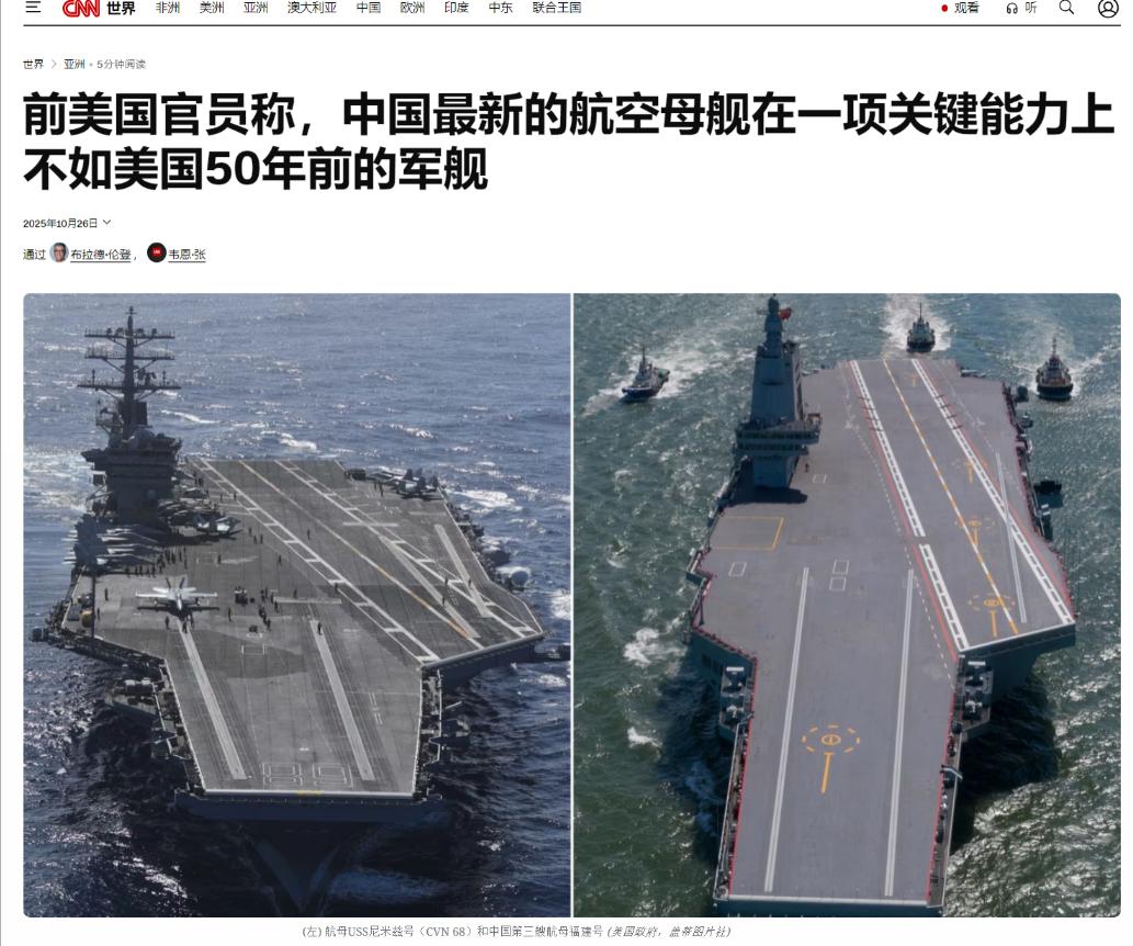 福建舰的斜角甲板设计确实存在这个问题!这回 CNN 真没说错,在舰载机调动上阵会有一些影响,目前唯一的争议是这个影响到底有多大? CNN 援引的那几位美国海军退役人员,倒是没瞎扯,先承认了福建舰的电磁弹射技术确实够顶,看现在公开的训练画面,这玩意儿运行起来确实没挑儿,但话锋一转就点到了斜角甲板的问题,说弹射器侵入甲板区域的情况挺明显。 具体来说,问题出在弹射器和斜角甲板的位置关系上。福建舰有三条电磁弹射器,两条在舰首,一条在斜角甲板末端,麻烦就出在中间那条弹射器上,它的挡焰板往前伸了一块,正好蹭到了斜角甲板的降落区边缘。 舰载机降落的时候,斜角甲板上连个障碍物都不能有,不然稍有偏差就可能撞上去,这就意味着只要有飞机在降落,中间这条弹射器就没法用;反过来,要是用这条弹射器起飞战机,降落作业就得停下来,只能靠舰首那条弹射器单独撑着,调动起来确实有点别扭。 这事儿说起来也不是设计没考虑到,主要是当初造舰的时候有个小波折。一开始福建舰计划装的是蒸汽弹射器,要是按蒸弹的尺寸来布局,起飞区能往舰首再挪个二十米,挡焰板就不会侵入降落区了,当时选 6 度的斜角甲板夹角,本来是为了提高甲板利用率,还能稳住舰体重心,算是挺优的设计。 没成想马伟明院士团队的电磁弹射搞得出乎意料的快,后来做对比试验,上千架次试下来,电弹在性能、稳定性上全把蒸弹比下去了,最后拍板换电弹的时候,舰体结构都已经基本定型了。 要是硬改斜角甲板,整个动力、通信子系统都得大调,服役时间至少得往后拖好几年,权衡下来还是先保电弹这个核心优势,甲板调度的问题只能先这么带着。 再往细了说,斜角甲板和舰体中轴线的夹角也有点讲究。福建舰是 6 度,美国尼米兹级是 9 度,就差这 3 度,甲板上凭空多出来近 9 米的间隔,刚好能让尼米兹级的弹射器和降落区彻底错开,人家就能一边起飞一边回收飞机,高峰时候 24 小时能出动两百多架次。 福建舰这 6 度的夹角,就没法做到完全并行,真要是高强度作战,得在起飞和降落之间来回切换模式,没法两边同时推进。 不过要说这影响到底有多大,就得结合实际的作战场景来看了。现代航母打仗,90% 的时间都是波次出动,先集中放飞一批战机形成打击编队,等这批战机返航了再开始回收,很少会出现一边起飞一边降落的情况,这种模式下,弹射器和降落区的冲突基本用不上。 就算遇到极端情况,比如需要持续保持空中存在,得循环起飞降落,靠智能调度系统避开那条碍事的弹射器,整体作战效能的损失也就在 7% 左右,算不上伤筋动骨。 而且换个角度看,用这点调度上的小遗憾,换来了电磁弹射的代际优势,太值了。福建舰的电磁弹射是中压直流架构,能量利用率能到 90%,弹一次才耗 34 度电,跟家里空调开一小时差不多。 美国福特级用的中压交流方案,利用率才 60%,一次弹射要耗的电够三百户家庭用一天。 更关键的是适配性,福建舰从 5 吨的无人机到 35 吨的空警 - 600 预警机,都能稳稳弹出去,福特级至今都没解决 F-35C 的适配问题,满载弹药的战机弹出去经常轨迹跑偏,起落架都快扛不住了,隐身涂层还老掉。 福建舰还解决了常规动力航母的电力难题,靠 “超级电容 + 飞轮储能” 的设计,40 秒就能充好电,一分钟能弹 3 架战机,单日最大出动架次能到 280 架次,比福特级还多出不少。 这种爆发力刚好契合咱们的战略需求,不用像美国航母那样全球部署拼持续作战,在西太平洋这边,30 分钟内就能放飞 36 架歼 - 35、歼 - 15T 和空警 - 600 的混合编队,首轮打击就能覆盖到关岛,这才是关键。 那些说这是 “致命缺陷” 的,多少有点夸大其词。要是真算致命,福建舰也不会顺利完成三型舰载机的起降训练,还初步具备了全甲板作业能力。说白了,这就是个取舍问题,任何武器设计都没有十全十美,关键看核心需求在哪。 福建舰的核心是电磁弹射带来的打击效率,不是尼米兹级那种靠持续出动撑着的全球部署能力,所以甲板调度这点影响,完全在可接受范围内。 再说这也只是过渡问题,等后续的核动力航母出来,舰岛能做得更小,甲板空间更充裕,把斜角甲板角度调到 9 度,再多加几台升降机,这些调度上的小麻烦自然就解决了。 现在福建舰这状态,已经能满足现阶段的作战需求,毕竟电磁弹射这张王牌在手,比甲板上那点小瑕疵重要多了。 所以 CNN 说的问题确实存在,舰载机调动时会受点影响,但要说这影响能动摇福建舰的作战能力,那就有点言过其实了。 真到了实战中,没人会盯着那 3 度的甲板夹角较劲,毕竟能在几十秒内弹射出一批隐身战机和预警机,才是最让人头疼的地方。 参考资料:CNN报道《前美国官员称,中国最新的航空母舰在一项关键能力上不如美国50年前的军舰》