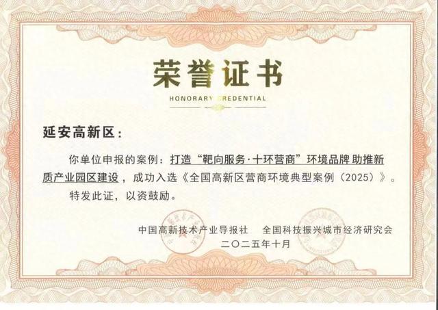近日,由中国高新技术产业导报社、全国科技振兴城市经济研究会组织的《全国高新区营商环境典型案例(2025)》评选结果正式发布,延安高新区《打造“靶向服务·十环营商”环境品牌,助推新质产业园区建设》案例成功入选,进入全国高新区营商环境建设的典范行列。