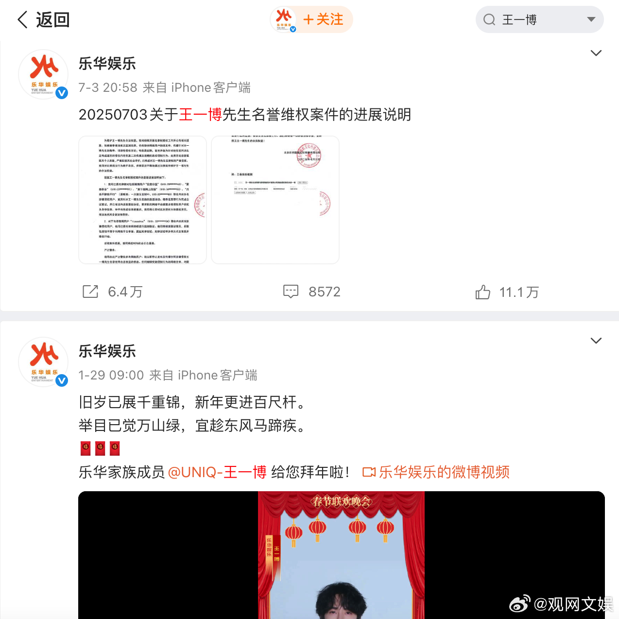 王一博已成立个人独资工作室【乐华娱乐今年只发了3次王一博】近日,曝王一博不续约乐华登上热搜,截至发稿前王一博方仍未回应相关热议。值得一提的是,在账号关注页面查询发现,王一博并未关注乐华娱乐官方账号。此外,在乐华娱乐账号查询王一博发现,其今年仅发了3次王一博相关动态,分别为维权案件和新春祝福,距24年13次动态存在明显差异。当前据企查查信息显示,王一博名下已关联3家存续企业,其与王正兴分别担任股东身份,王一博多持股超60%。