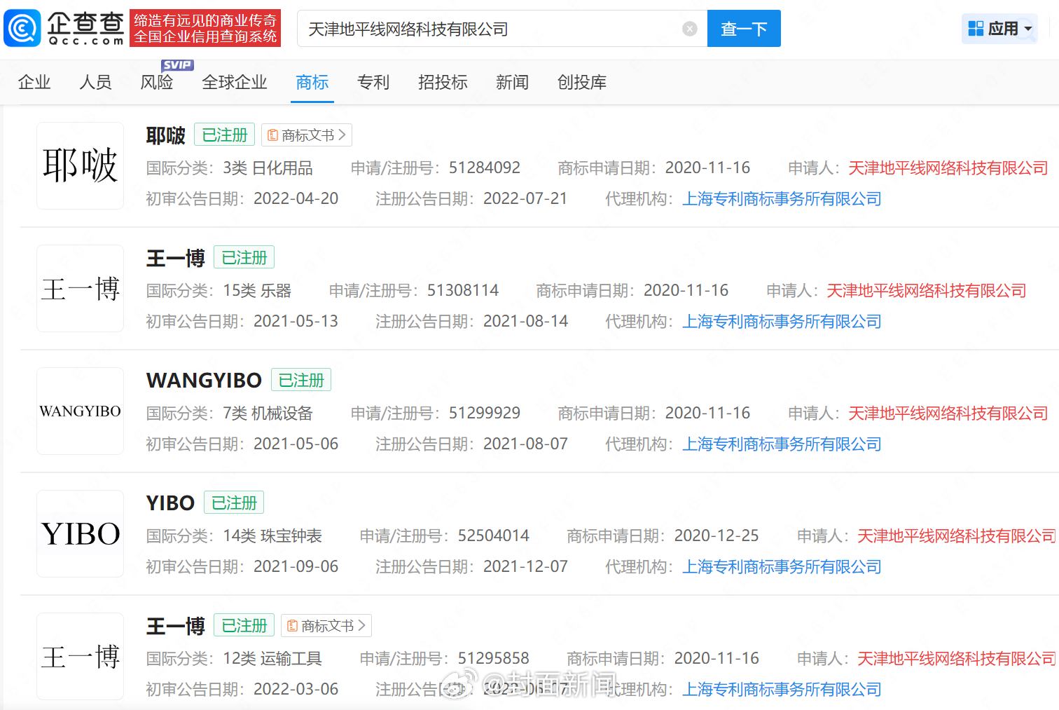 值得注意的是,王一博持股70%的天津地平线网络科技有限公司已申请注册多枚“王一博”“耶啵”“WANGYIBO”“YIBO”商标,国际分类涉及日化用品、乐器、珠宝钟表等,当前部分商标已注册成功。曝王一博不续约乐华