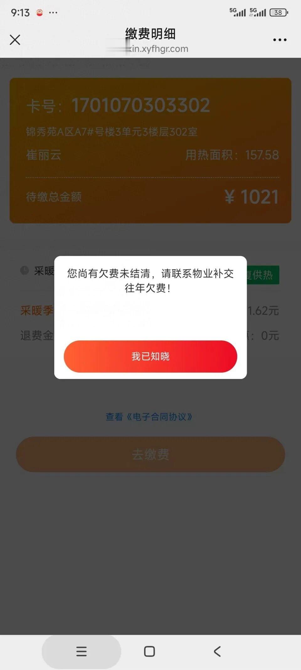 如今眼瞅着要入冬,需要交暖气费。林先生登录沣河热力的公众号,在上面操作准备交暖气费,可谁知系统却提示“存在欠费,请联系物业补交往年欠费”。
