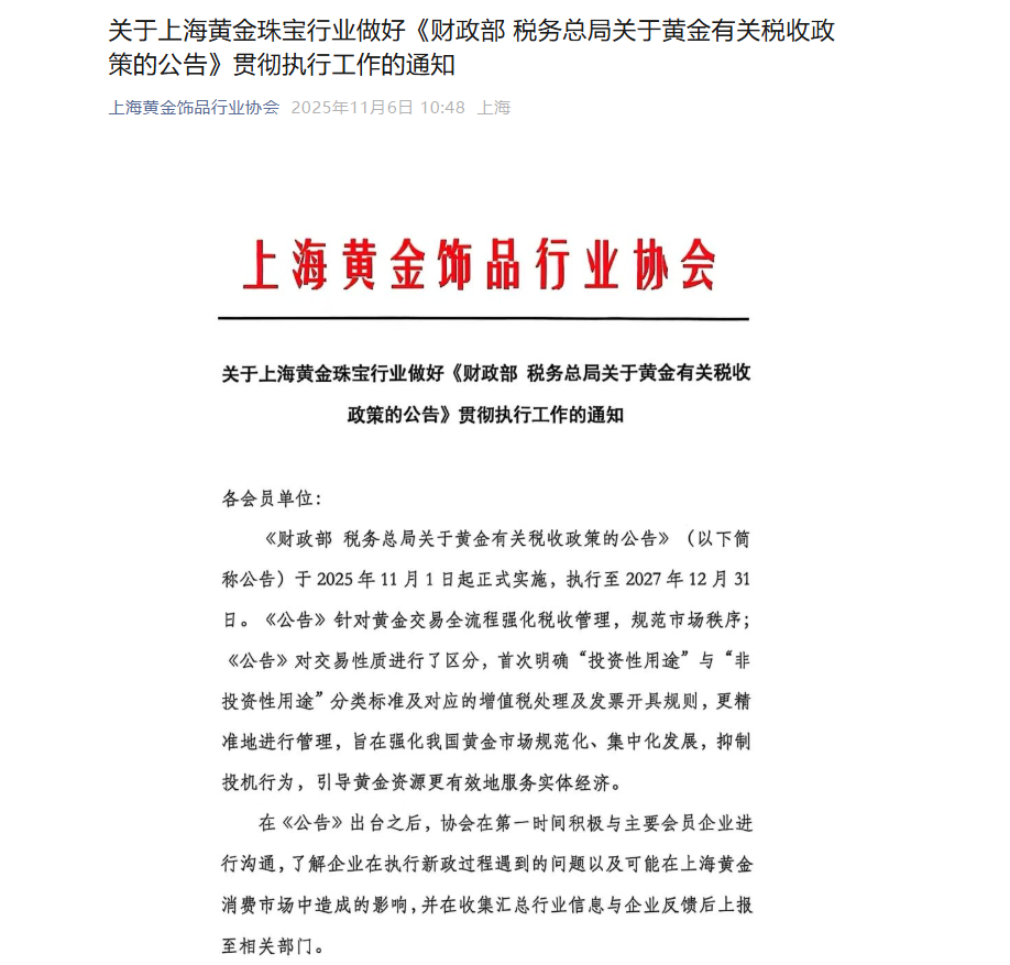 11月6日,上海黄金饰品行业协会发布关于上海黄金珠宝行业做好《财政部税务总局关于黄金有关税收政策的公告》贯彻执行工作的通知,要求各会员单位应当准确把握政策要求,规范税收征管操作,做好企业内部的合规化管理,强化保障措施做好税收新政的落地实施工作,与此同时,进一步提升产品品质、服务水平、品牌影响力,确保市场平稳发展。