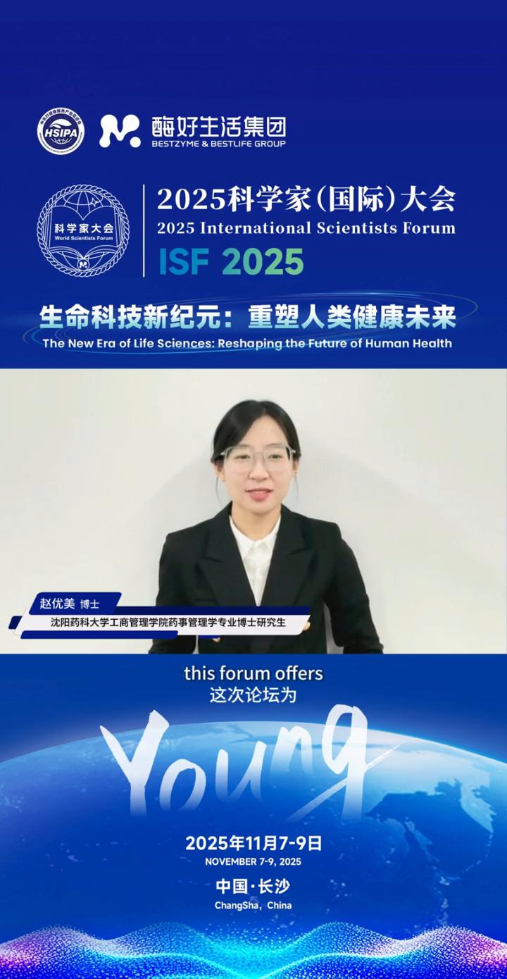 Hello,everyone,I'm zhao yumei,currently conducting research as shanyang pharmaceutical university. I'm honored to be part of the twenty twenty five young scientists form at the twenty twenty five international scientists form. Well,I will present my research on artificial intelligence and date analytics. under the theme,the new era of the life sciences. resipping the future of the human health. This form offers a global platform for young researchers like us to share and collaborate. What i'm most excited about is interacting with nobel lawyers. Let's explore the frontiers of the science together.