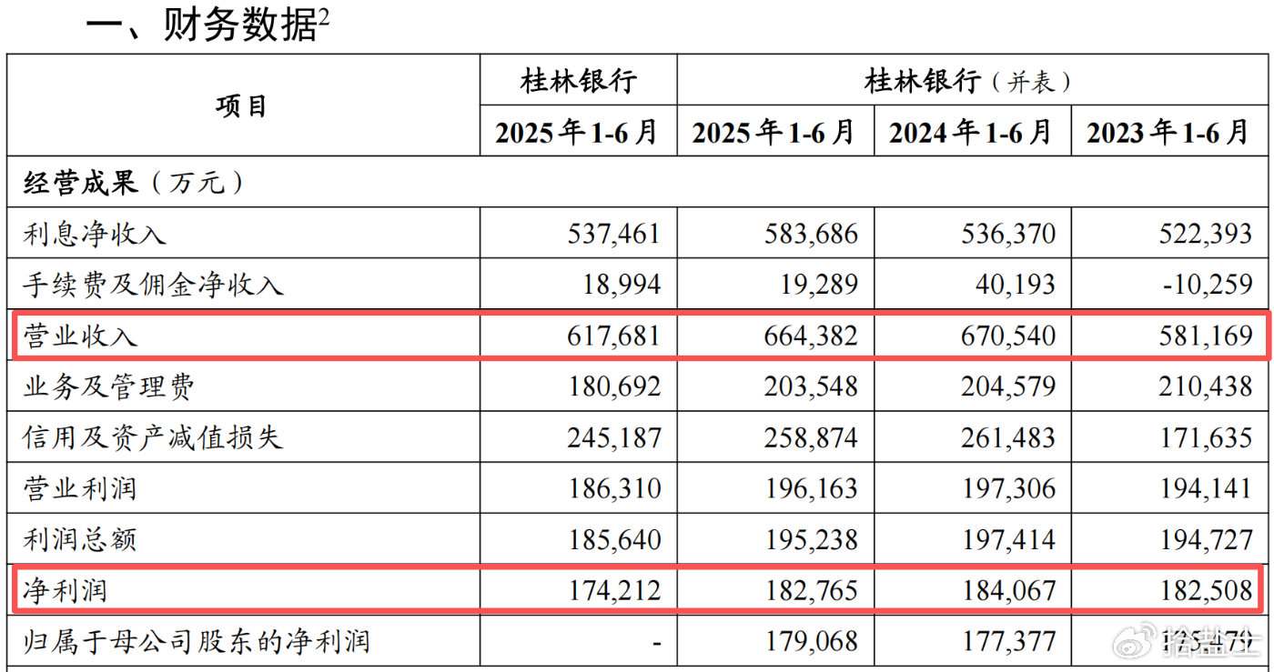 2025年上半年,桂林银行营收利润双降,期内实现营业收入66.44亿元,比去年同期减少了约0.61亿元;实现净利润18.28亿元,同比下降0.71%。时间线拉长,不难看出桂林银行业绩增速放缓的现状。