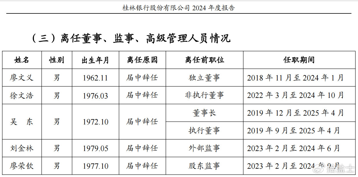 据不完全统计,2023年-2024年两年间,桂林银行已有包括吴东在内的18名董监高离任。其中,届满离任的董监高仅7名,其余皆是届中辞任。短时间内多名高管离职,对桂林银行的内部治理、战略执行、市场信心等方面难免产生一定的影响。