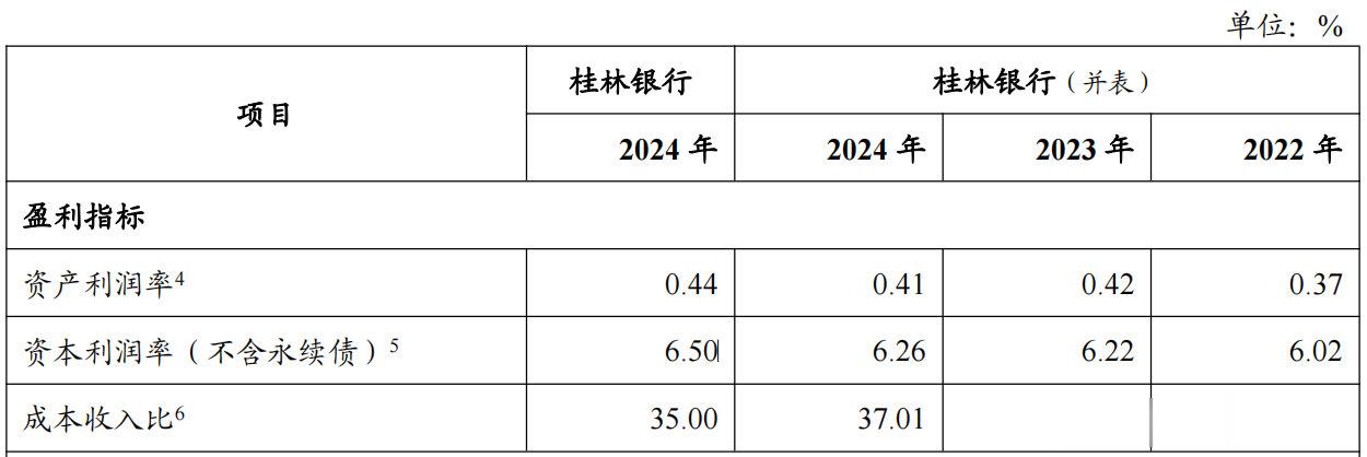 需要注意的是,桂林银行的资产利润率和资本利润率均未达到监管要求。2021年-2024年,桂林银行的资产利润率分别为0.35%、0.37%、0.42%、0.41%,资本利润率分别为6.46%、6.02%、6.22%、6.26%。两者常年低于0.6%、11%的监管红线,折射出桂林银行盈利能力的薄弱。