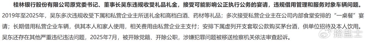 2025年9月30日,桂林银行原党委书记、董事长吴东被桂林市纪委监委通报。公开信息显示,2019年至2025年,吴东多次违规收受下属和私营企业主所送的礼品礼金,接受可能影响公正执行公务的宴请,违规借用管理和服务对象车辆,虚列开支套取公款购买茅台酒。目前,吴东已经被采取“双开”措施,移送检察机关依法审查起诉。